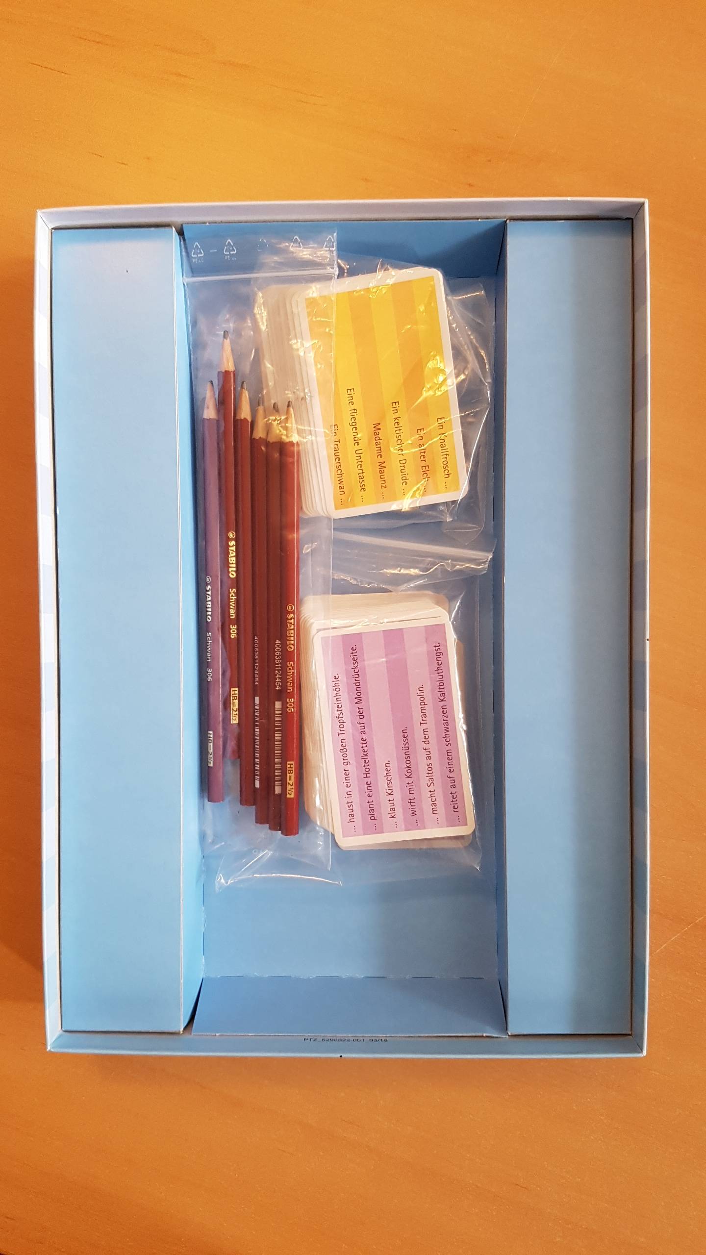 Am Anfang steht ein skuriler Satz. Diesen verwandelt ihr in ein Kunstwerk. Danach faltet ihr den Satz weg und gebt euer Kunstwerk an den Nachbarn. Dieser wiederum schreibt auf welche Geschichte er in dem Bild sieht. So werden die Blätter reihum weiter gegeben bis jeder mal an der Reihe war. Am Ende schaut ihr euch gemeinsam an, was aus euren Anfangssätzen geworden ist - und lacht gemeinsam über die Ergebnisse.