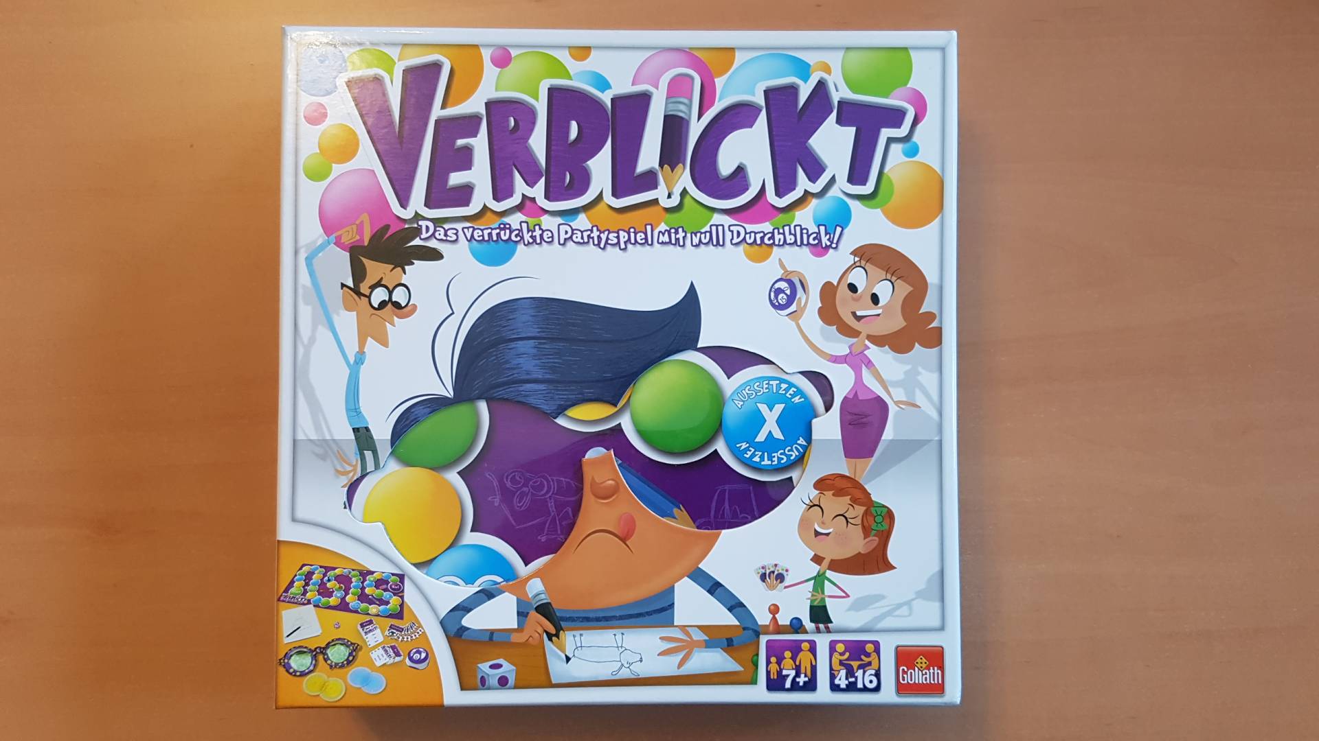 Bei diesem Partyspiel blickt keiner richtig durch: Die Spieler tragen hier eine verrückte Brille, die den Blick total verzerrt. Nun müssen sie Begriffe zeichnen – die Motive unfall- und lachfrei aufs Papier zu bringen, ist dabei fast unmöglich. Ein Würfelwurf entscheidet, welcher Begriff auf der Aufgabenkarte gemalt wird. Die Karte zeigt auch, welche der drei Brillenstärken der Spieler beim Zeichnen tragen muss. Grün, Gelb oder Blau – mit jeder Farbe steigt der Verzerrungsgrad.