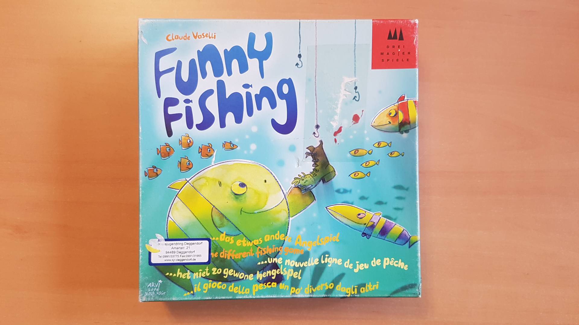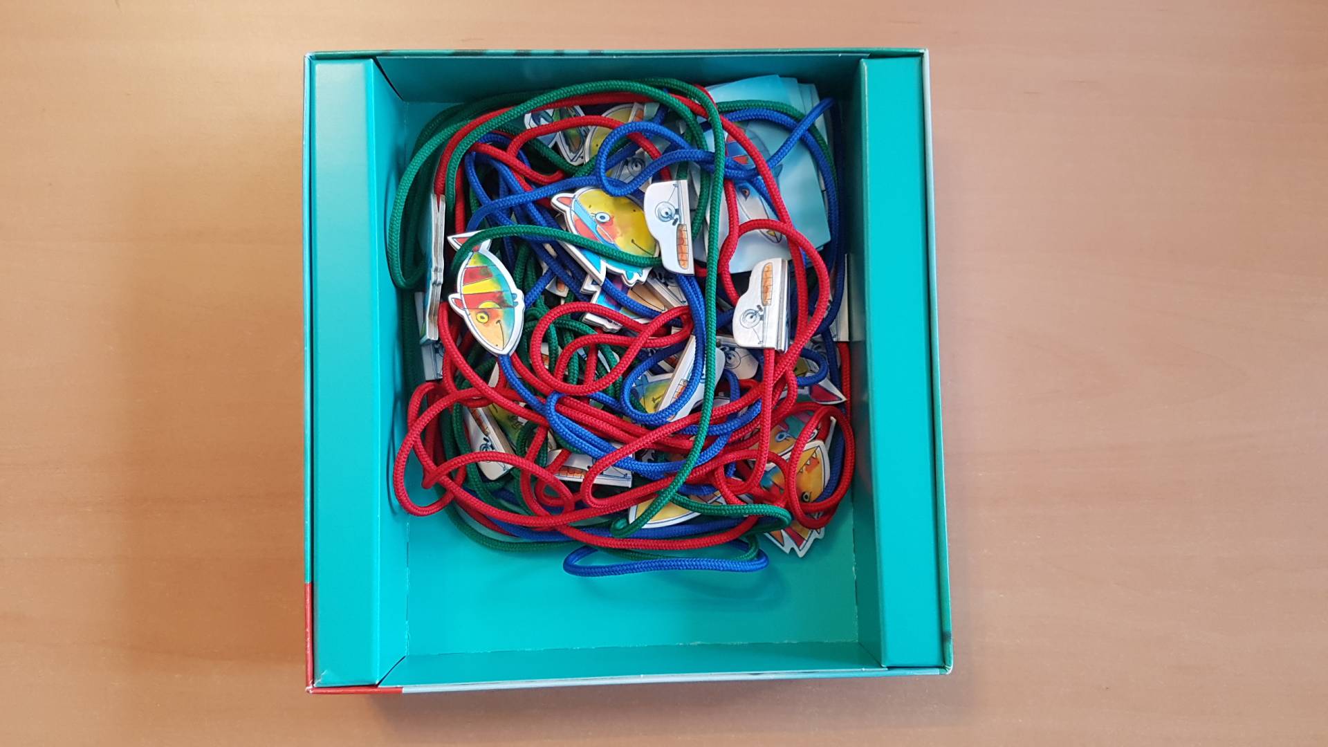 Kreuz und quer, übereinander, untereinander und miteinander verschlungen liegen 18 farbige Angelschnüre auf dem Tisch, an deren Enden farbige Fische hängen. Und jetzt soll man genau an der Schnur ziehen, an deren Ende der Fisch hängt, der auch auf der aufgedeckten Karte abgebildet ist.