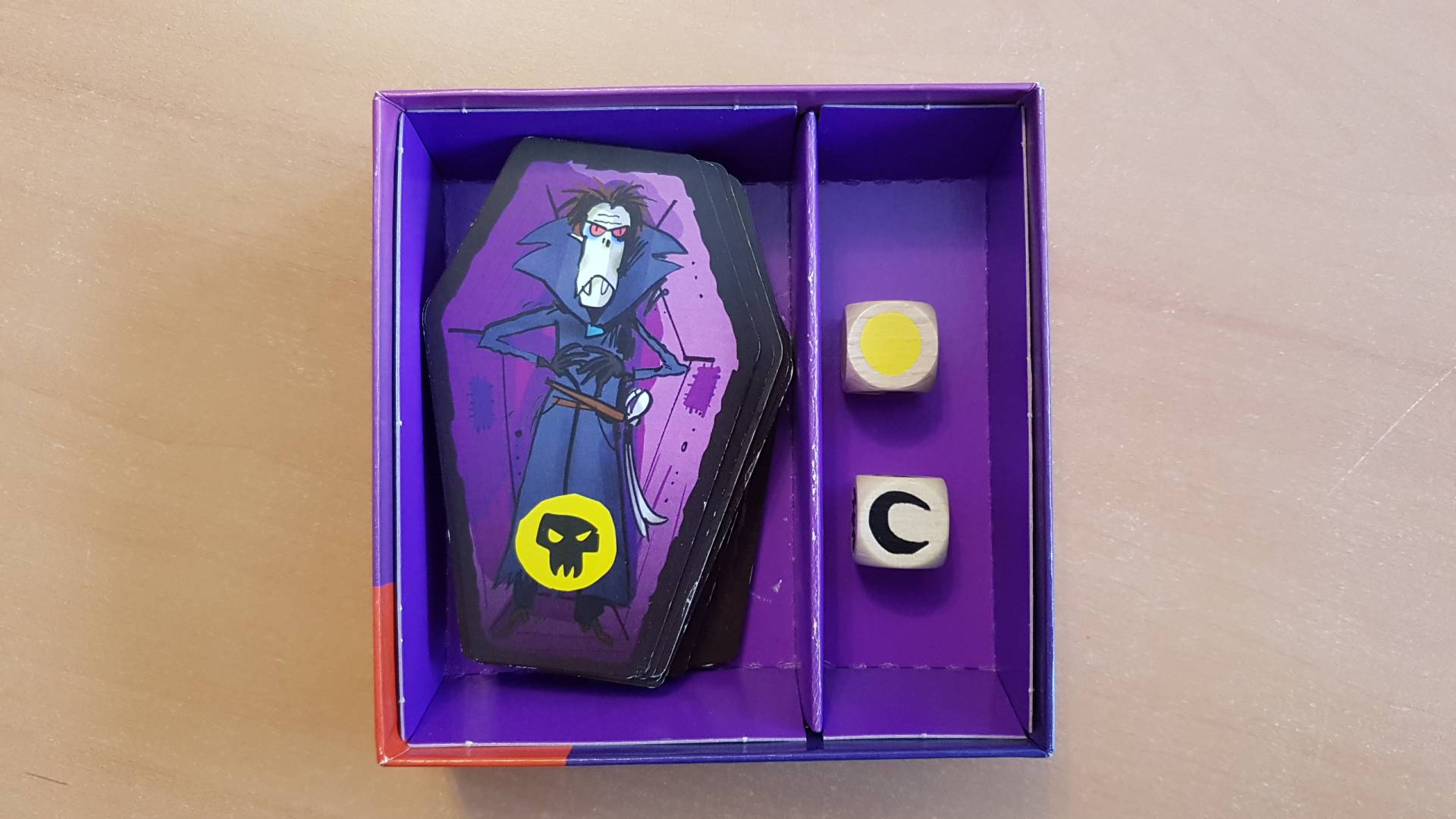 Bringt eure Vampire so schnell wie möglich in den Sarg und dann weg damit! Wenn die passende Kombination aus Hintergrundfarbe und Symbol gewürfelt wird, müsst ihr als erster auf die Knoblauch-Karte schlagen. Aber nichts verwechseln! Denn wer sich irrt, bekommt noch mehr Vampirbesuch ...