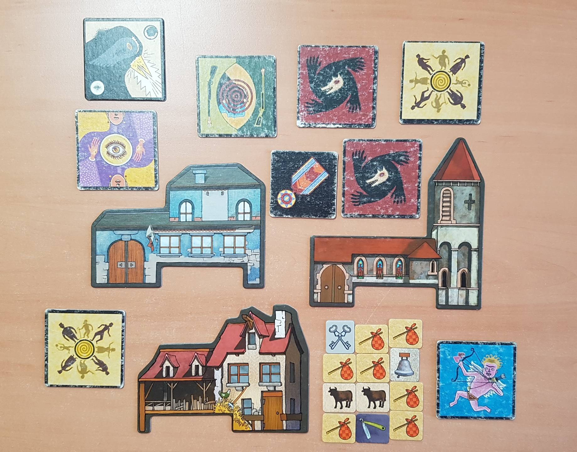 3 neue Rollen bringt diese großformatige Erweiterung: Der Rabe schwärzt seine Mitbürger an, der Brandstifter hat ein herzerwärmendes Gemüt und der Weiße Werwolf ist die Böartigkeit in Person. Aber viel interessanter sind die Gebäude im Dorf. Manch ein Spieler wohnt dort und bekommt dadurch zusätzliche Fähigkeiten, andere leben auf der Strasse als Vagabunden.