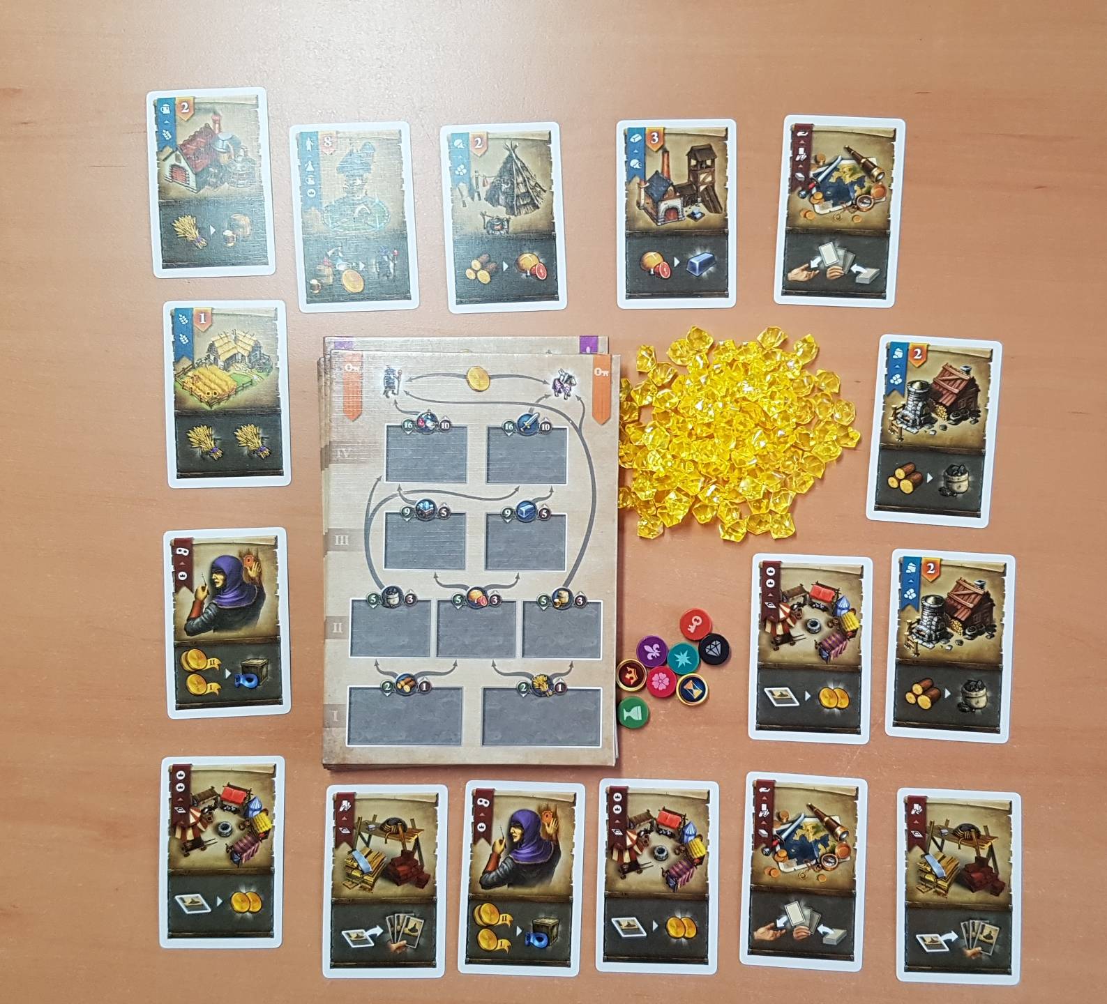 Als weiser mittelalterlicher Herrscher weißt du, dass der Schlüssel zu einer florierenden, wohlhabenden Stadt im Handwerk liegt. Je mehr und besser deine Handwerker arbeiten, desto reicher wirst du. Also sorge dafür, dass die Produktionsketten wie geschmiert laufen, denn alle Rohstoffe und Güter hängen direkt voneinander ab. Aus Getreide wird frisches Brot oder Bier, das wiederum die Eisengießer versorgt, die das Metall herstellen. Und aus Metall fertigen die Schmiede Schwerter für deine Ritter. Doch ganz so einfach ist es nicht, effiziente Produktionsketten aufzubauen! Durch geschicktes Handeln am gemeinsamen Markt oder durch fiese Aktionen können die Mitspieler selbst deine besten Pläne durchkreuzen.
