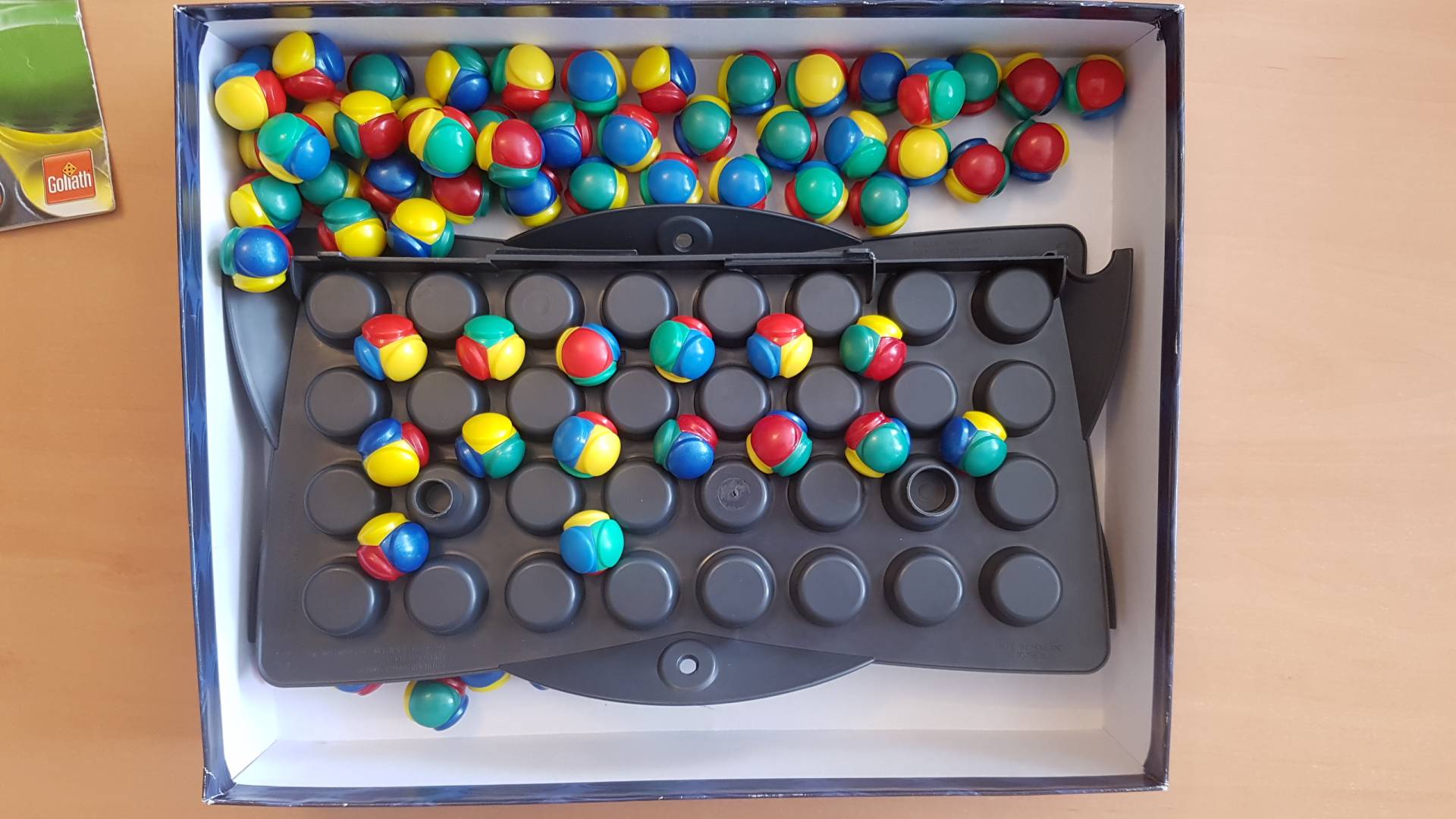 Das Spiel ist im Grunde genommen ein 4 -Spieler-Othello. Kugeln mit 4 Farben rollt man zur richtigen Farbe hin, wenn man am Zug ist.