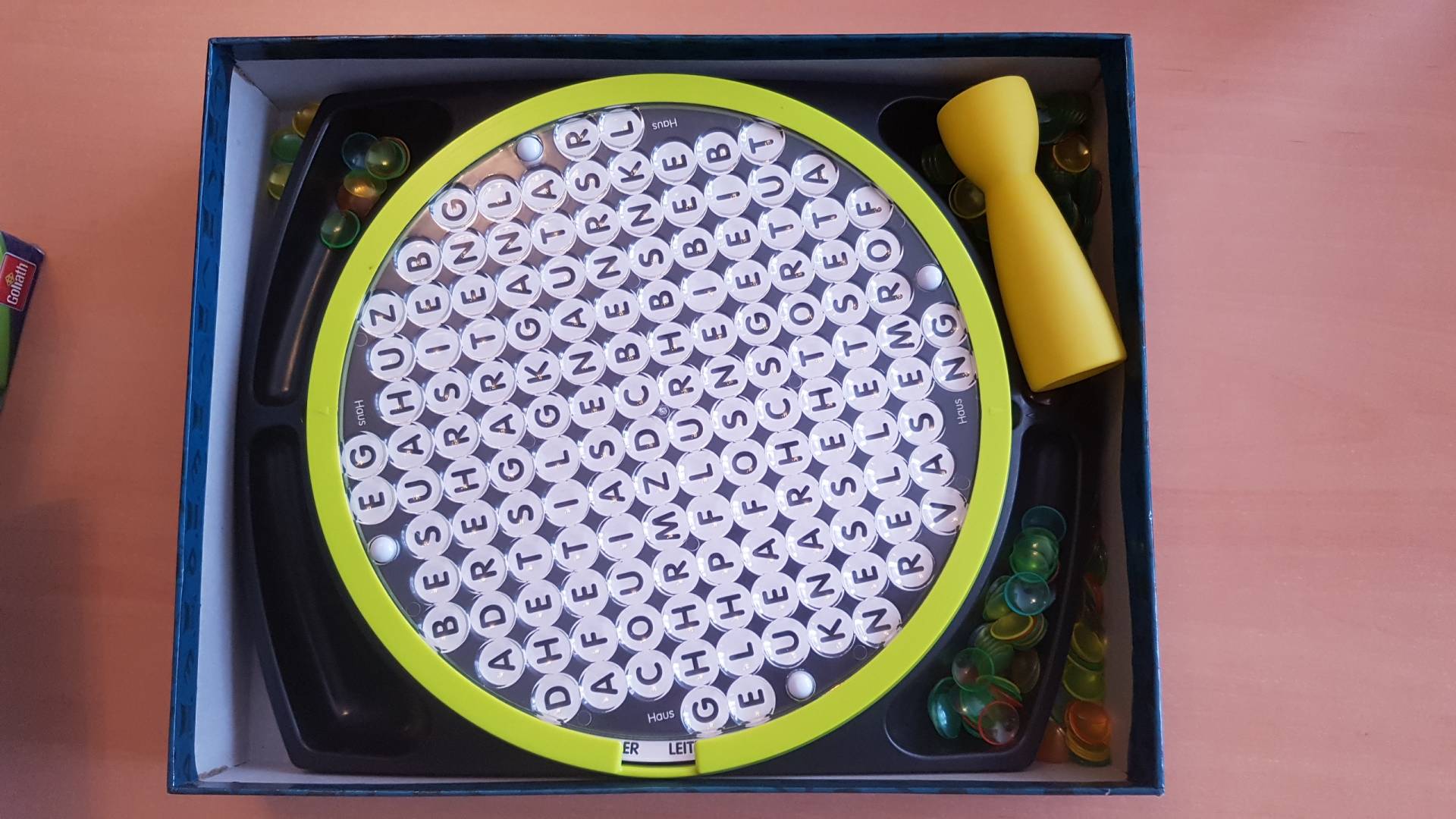 Das Wortsuchspiel mit dem gewissen Dreh! Sei schneller als deine Mitspieler und entdecke das versteckte Wort zuerst, und markiere es mit deinen Spielsteinen. Doch aufgepasst: wenn ein anderer Spieler dein Wort durchkreuzt sind deine Markiersteine futsch. Wer am Ende die meisten Steine auf dem Spielbrett hat, gewinnt! Ein schönes Familienspiel, bei dem auch das Lesen spielerisch gefördert wird!