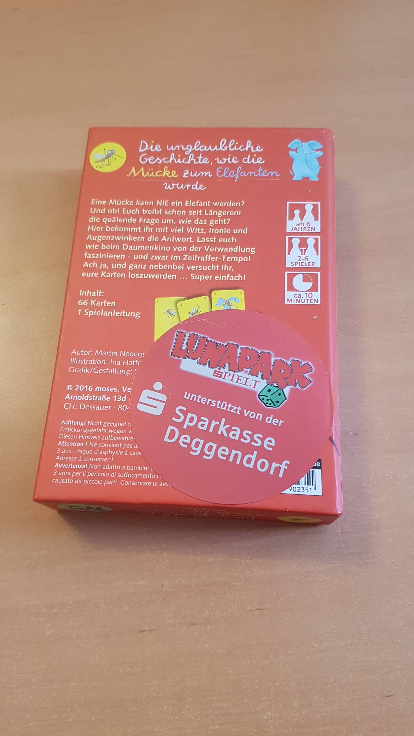 Alle Spielenden starten mit sieben Handkarten, der Rest der Karten bildet den Nachziehstapel. Eine Karte dient als Start für den Ablagestapel. Die Karten zeigen, ganz ähnlich einem Daumenkino, wie sich eine Mücke auf der Karte mit dem Wert 1 langsam zu einem Elefanten auf der Karte mit dem Wert 10 verwandelt. (Gleich vorweg: Ein tatsächliches Daumenkino lässt sich daraus leider nicht basteln, dafür sind die Karten dann doch zu stabil. Schade, das wäre ein wirklich nettes Gimmick gewesen.)