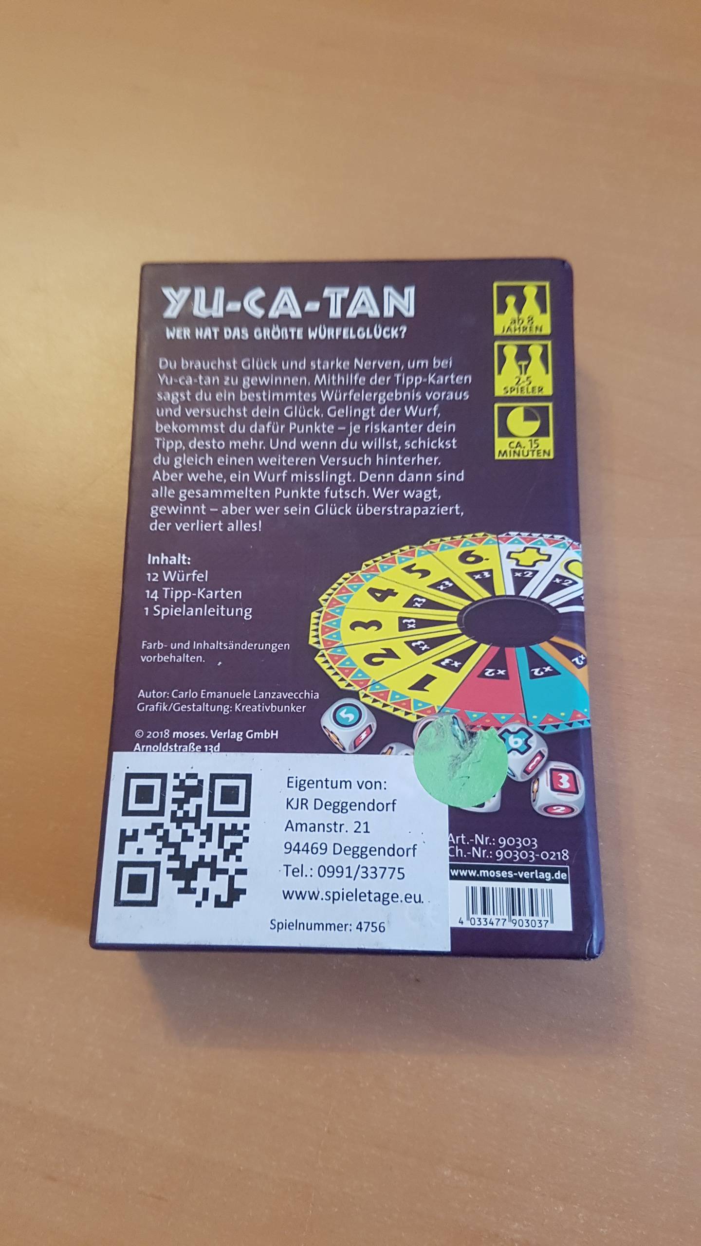 Wer hat das größte Würfelglück? Tippen - würfeln - abräumen. So einfach funktionier Yu-ca-tan. Die Spieler entscheiden sich für eine Tipp-Karte und hoffen, dass ihnen das Würfelglück zur Seite steht. Gelingt der Wurf? Dann bekommen sie Punkte... oder sie wagen gleich einen weiteren Versuch. So winken noch mehr Punkte, aber bei einem Fehlwurf sind alle Punkte futsch. Wer wagt, gewinnt - aber wer sein Glück überstrapaziert, verliert alles!