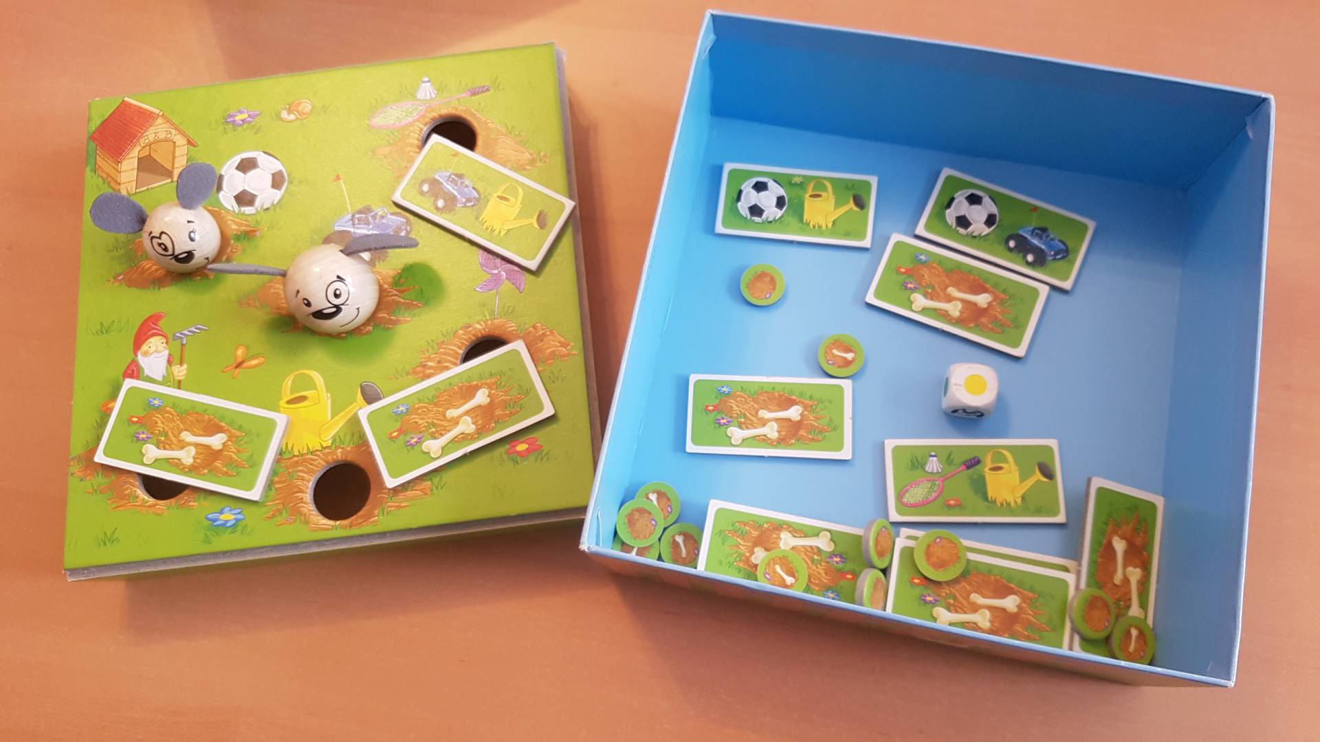 Wo sind denn nur die leckeren Knochen vergraben? Unermüdlich rennen Bella und Bello hin und her und buddeln und graben ... Ein Geschicklichkeitsspiel bei dem man die Nerven behalten muss, denn wenn ein Spieler "Wau, wau" ruft,ist auch schon der Nächste dran mit buddeln.