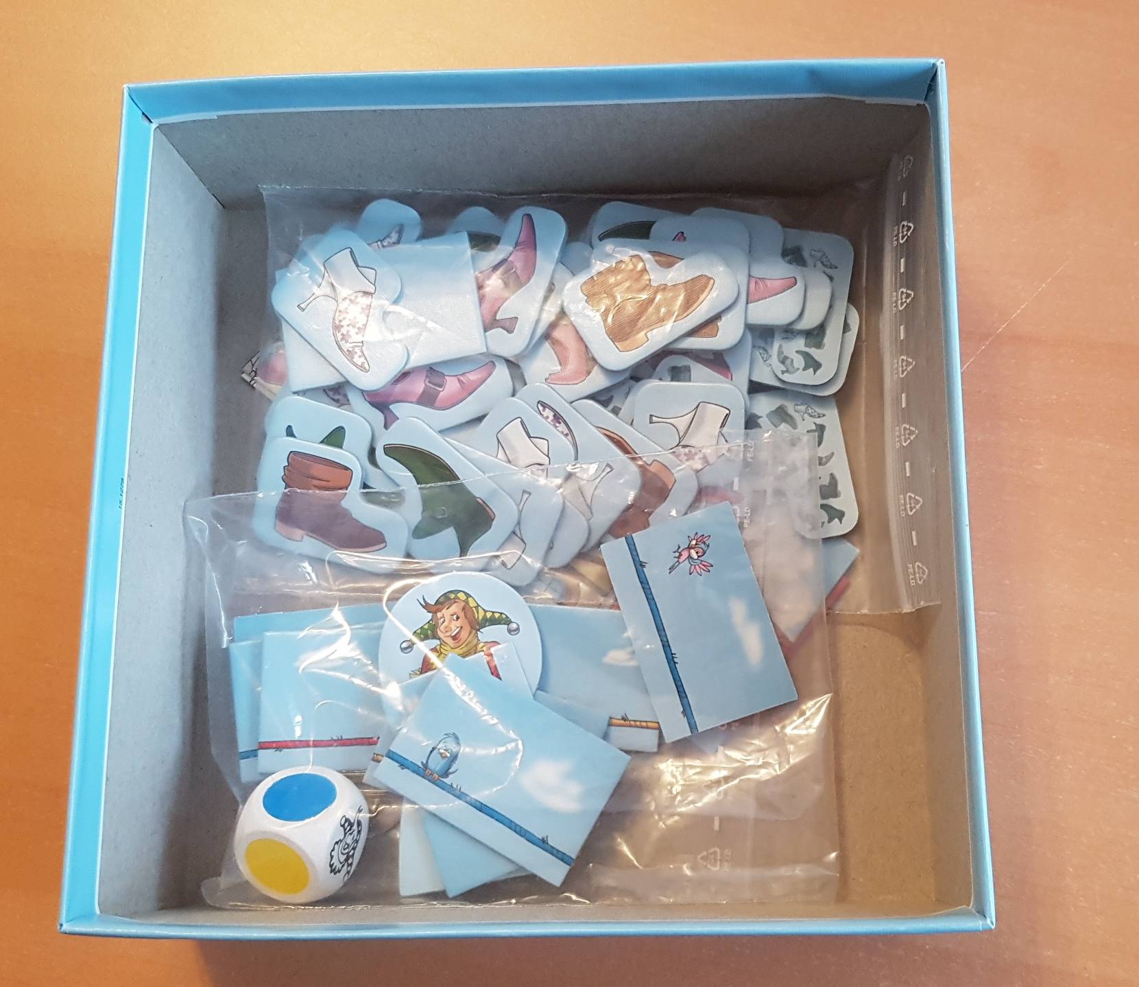 Till hat die Schuhe seiner Mitbürger in einen Sack gesteckt, die er mit auf ein Seil nimmt, das er zwischen zwei Häuser gespannt hat. Hoch oben balancierend, öffnet er den Sack und lässt all die Schuhe auf den Dorfplatz fallen. Was für ein Durcheinander! Wer schafft es zuerst, die passenden Schuhe wieder einzusammeln?