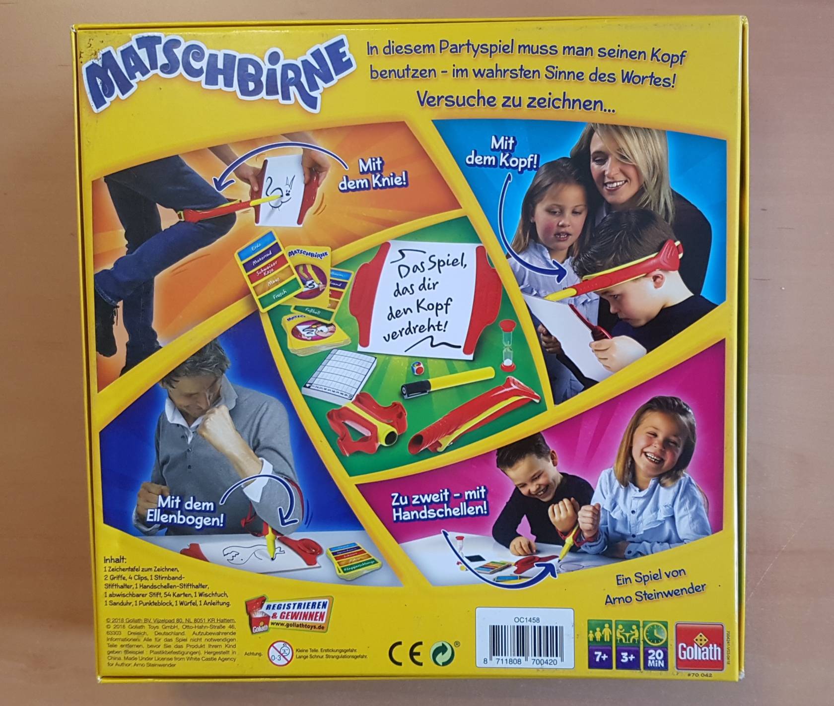 Bei Matschbirne müssen die Spieler mit vollem Körpereinsatz ihr Zeichentalent unter Beweis stellen. Gespielt werden kann einzeln aber auch im Team. Einer der Spieler zieht eine Karte und muss den Begriff der darauf steht zeichnen. Jedoch nicht mit Händen sondern unter erschwerten Bedingungen.