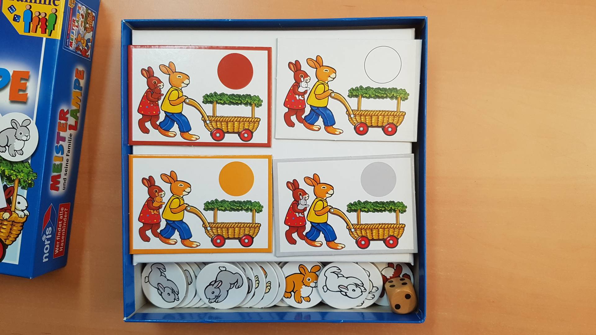 In the game, 32 bunny cards, each with 8 bunnies of one player color, are face down. The player whose turn it is rolls the die once and may reveal a card on a 5 or 6. If it is a card of your own color, you may keep it, otherwise you put it back face down. You may then continue to reveal cards until another player rolls a 5 or 6. If you roll a 1, you lose a bunny if you have collected an odd number of cards. The first player to collect 8 bunnies wins the game.