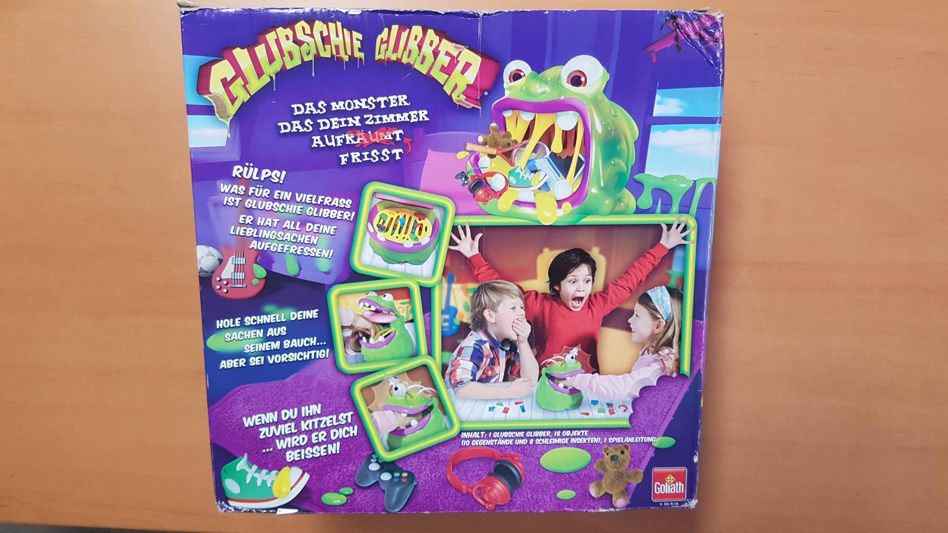 Glubschie Glibber hat sämtliche Gegenstände im Kinderzimmer mit seinem schleimigen Maul verschlungen. Nun ist er vom vielen Fressen aber müde und hält einen Verdauungsschlaf. Die mutigen Spieler haben nun die Chance, ihm ins Maul zu greifen und die ganzen Gegenstände wieder herauszuholen. Aber zwischen all den Schleim und Glibber tummeln sich auch Würmer und Maden - und die bringen Minuspunkte... Außerdem hat Glubschie einen leichten Schlaf und es besteht immer die Gefahr, dass er aufwacht.