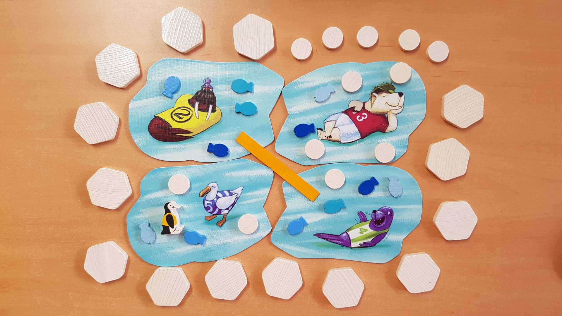 Pinguin auf die oberste Scholle und legt je einen Fisch auf die anderen Schollen. Dann schnippt