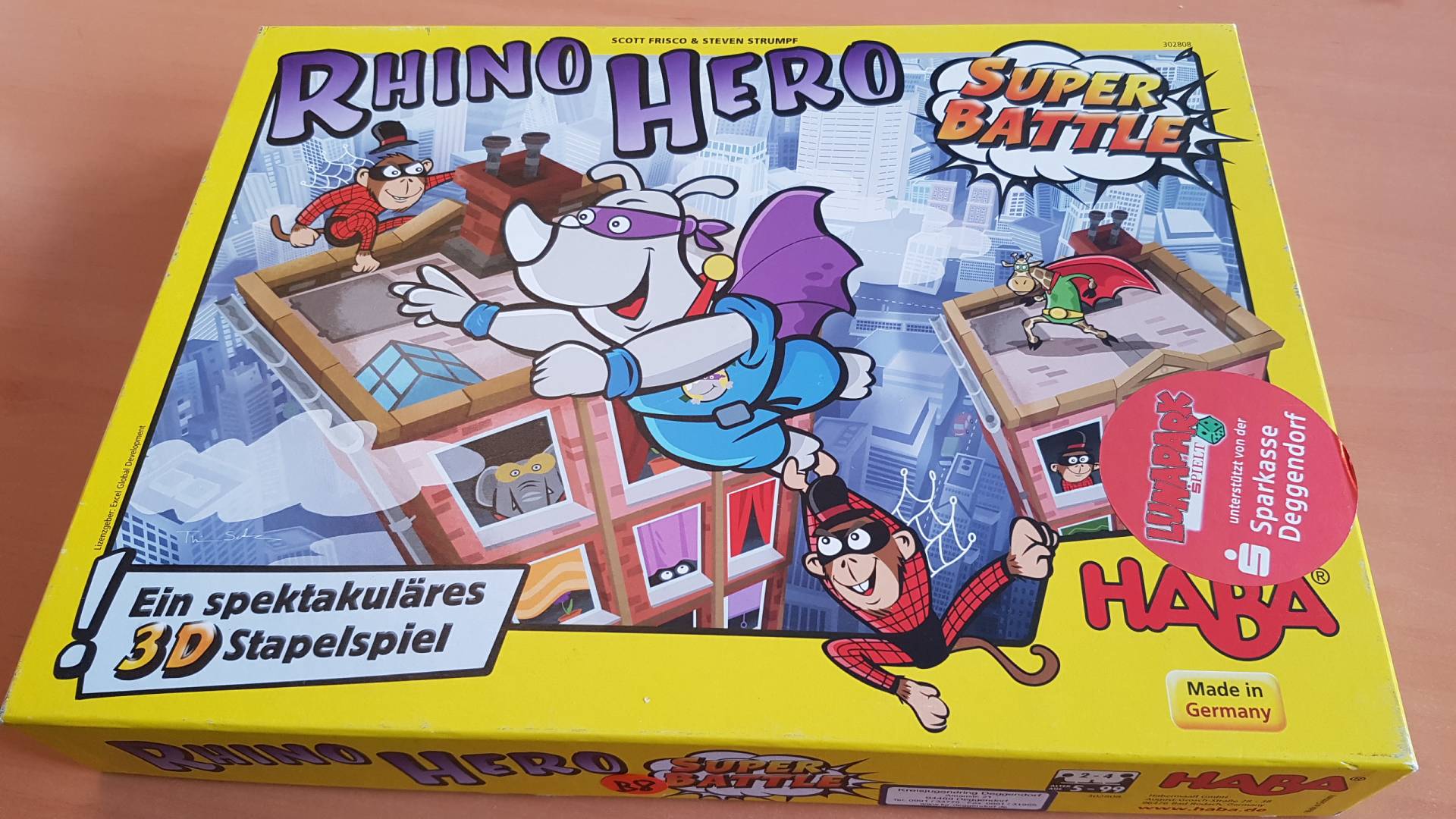 Rhino Hero und seine Superhelden-Freunde erleben jede Menge Abenteuer auf dem Wolkenkratzer aus Karten. Doch Vorsicht: Dieser wird immer höher und wackeliger, je mehr Karten als Wände und Böden aufgebaut werden. Wer geschickt würfelt, zieht den eigenen Superhelden weit nach oben und verteidigt seinen Platz in den Würfel-Battles gegen andere Spieler … wären da nicht die Spider-Monkeys, die den Wolkenkratzer zum Schwanken bringen.