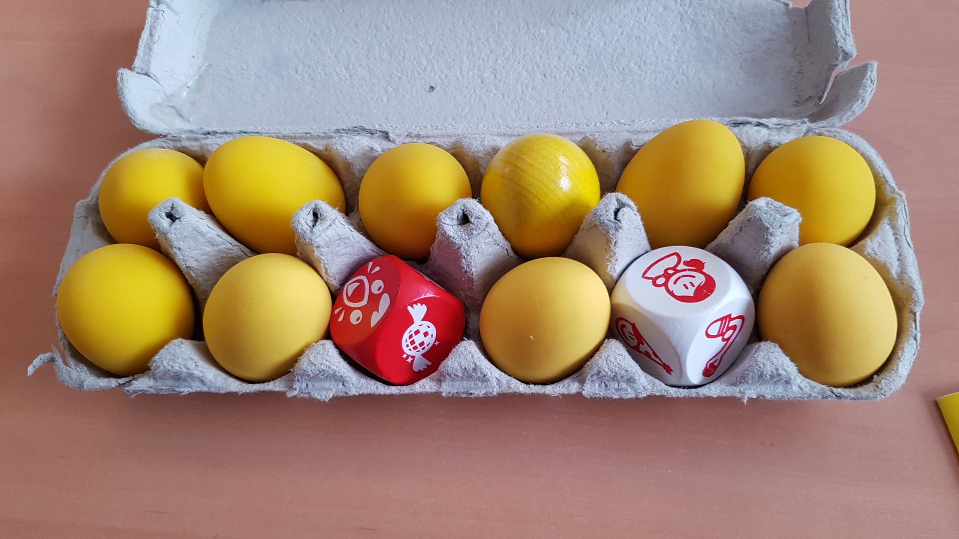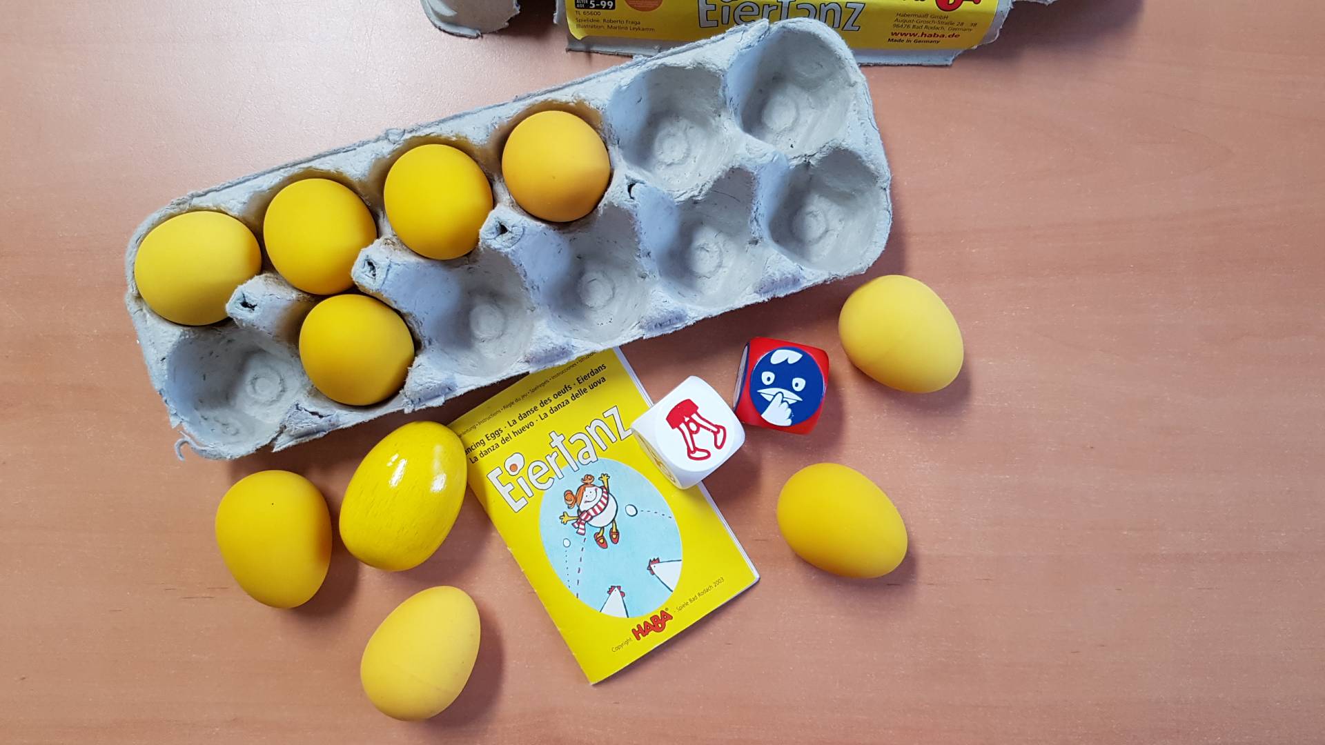 10 Eier, eines aus Holz, die anderen als Springeier beinhalten ein Spiel, das die Motorik fördert!Ein Würfel gibt vor, ob man sich ein Ei nimmt, oder die anderen ein wild springendes fan´gen müssen.Wo gibt ein 2. Würfel vor-Kinn,Achseln,Knie etc.Sobald einer ein Ei verliert gewinnt der mit den meisten Eiern am Körper!