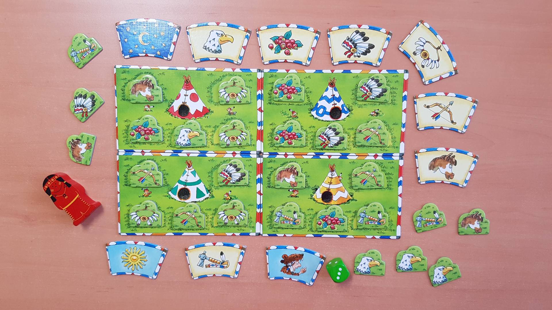 Das Kinderspiel „Kleiner Fuchs ganz groß“ ist ein findiges Memospiel von HABA mit liebevoll illustriertem Spielmaterial, das die Merkfähigkeit mutiger Indianerkinder fördert. Kleiner Fuchs, der kleine Indianerjunge, möchte gern genauso mutig werden wie sein Vater. Doch dafür muss er erst verschiedene Prüfungen bestehen, bei denen er auf die Hilfe der Kinder angewiesen ist. Dafür brauchen sie ein gutes Gedächtnis, denn nur so finden sie unter den Buschplättchen die passenden Abbildungen zu den Aufgabenfeldern. Leicht verständliche Regeln ermöglichen Spielspaß von der ersten Minute an.
