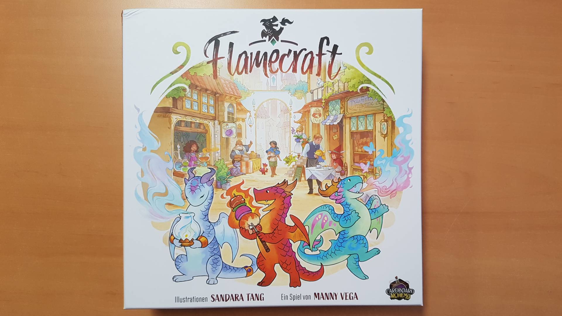 Flamecraft ist ein Drachen-Einsetzspiel mit gemeinsamem Engine-Building-Mechanismus für ein bis fünf Flammenhüter. Als solche tretet ihr gegeneinander an, um bekannter und erfolgreicher im Umgang mit der Flammenkunst zu sein als alle anderen in der Stadt. Steigert euren Ruhm, indem ihr Läden besucht, dort Werkeldrachen einsetzt, Verzauberungen wirkt und die Ziele eurer geheimen Schmuckdrachen erfüllt.