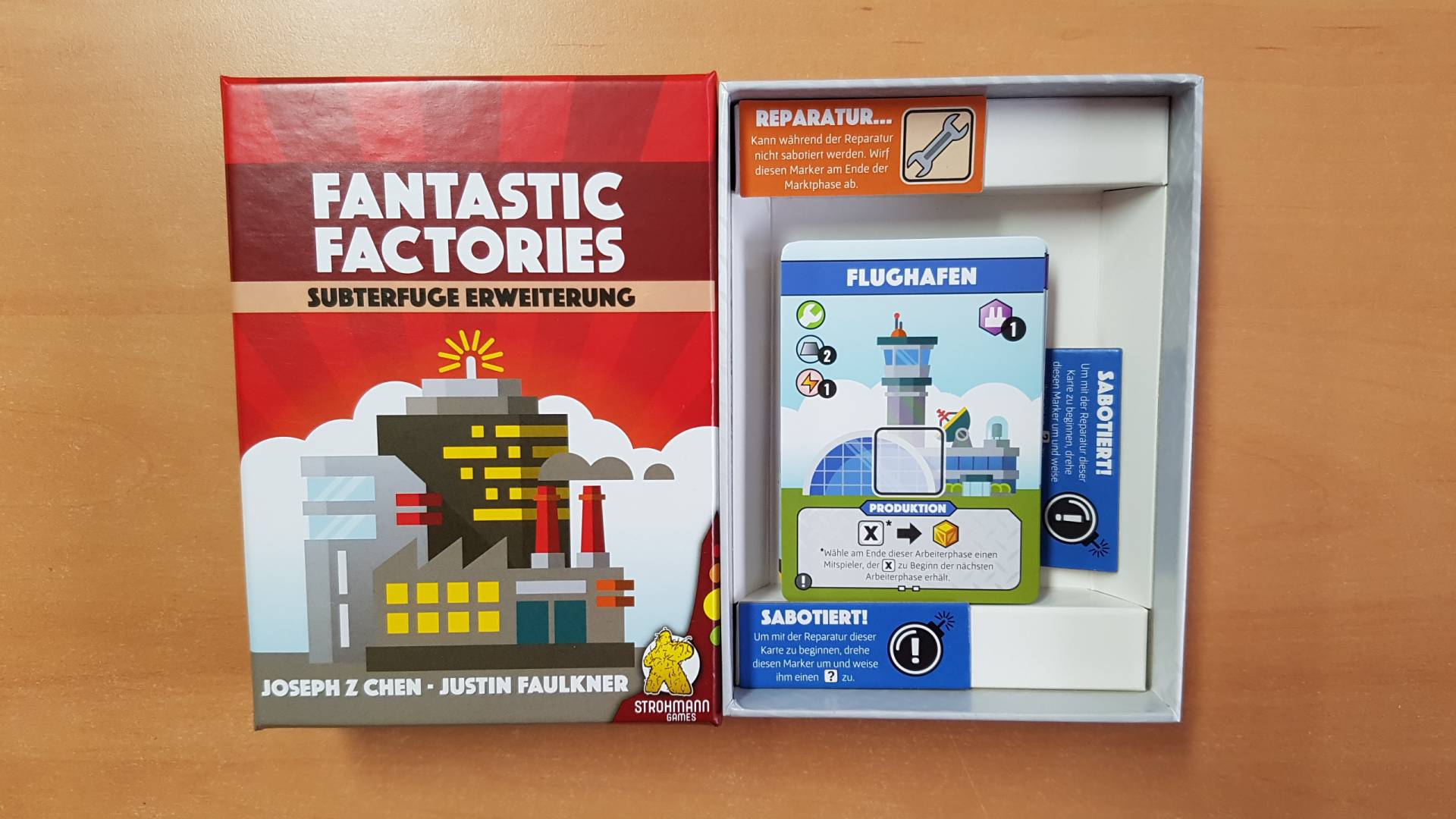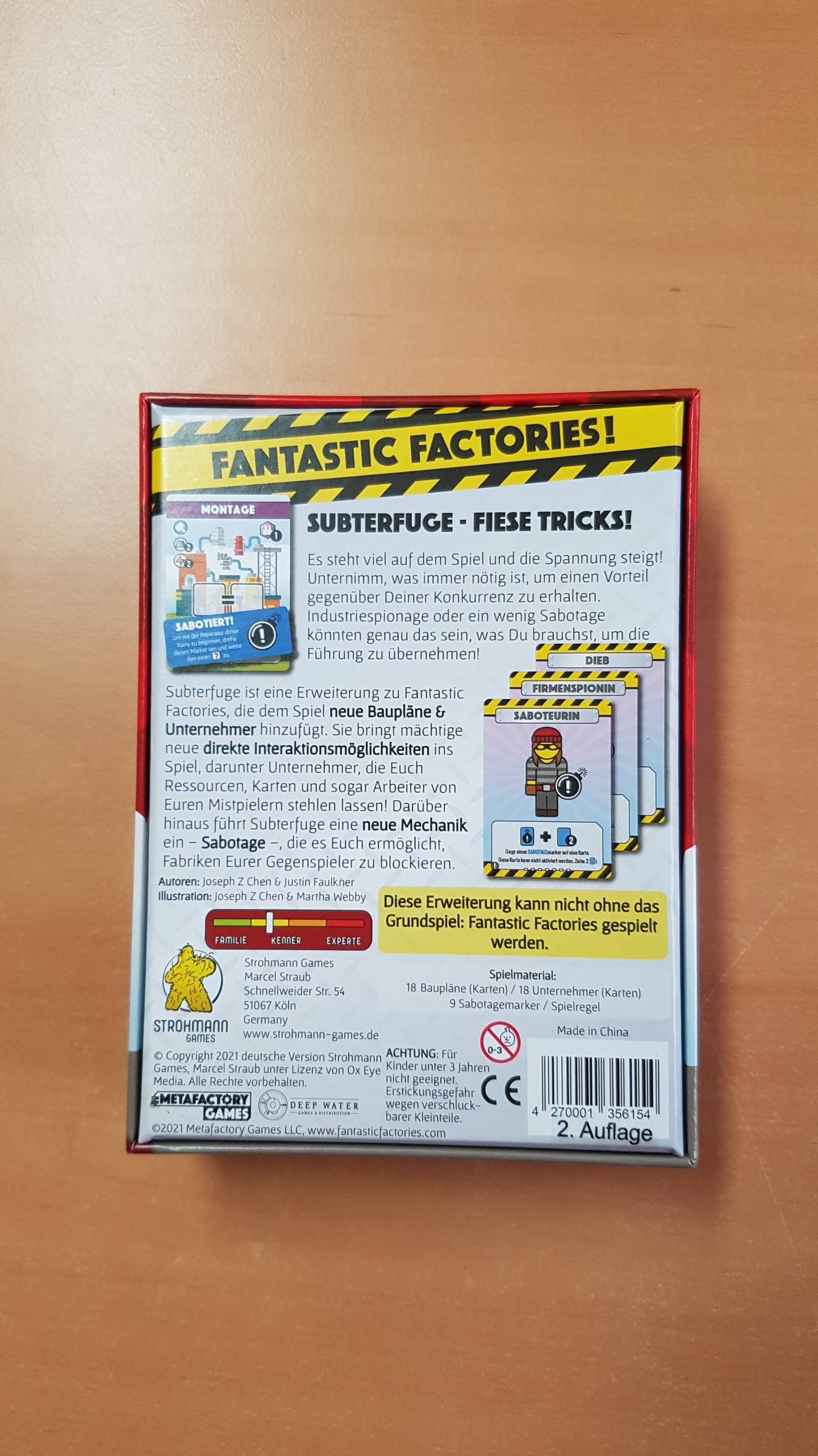 Subterfuge ist eine Erweiterung zu Fantastic Factories, die dem Spiel neue Baupläne & Unternehmer hinzufügt. Sie bringt mächtige neue direkte Interaktionsmöglichkeiten ins Spiel, darunter Unternehmer, die Euch Ressourcen, Karten und sogar Arbeiter von Euren Mistpielern stehlen lassen! Darüber hinaus führt Subterfuge eine neue Mechanik ein – Sabotage –, die es Euch ermöglicht, Fabriken Eurer Gegenspieler zu blockieren.
