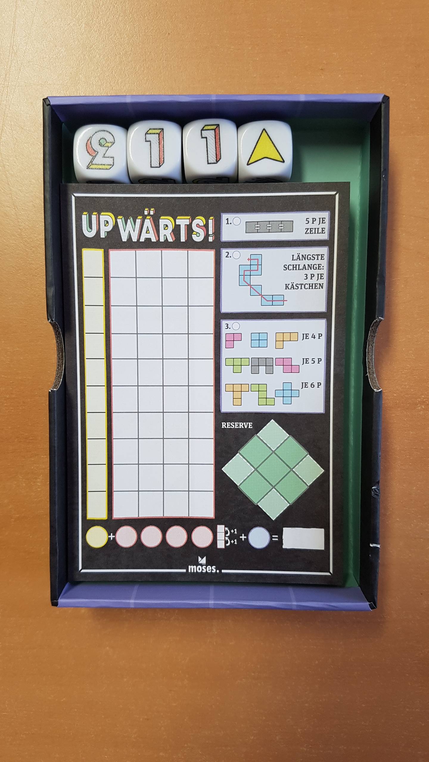 Beim vielseitigen Würfelspiel Upwärts fallen die Zahlen ins Raster! Und wenn etwas nicht passt, können die Zahlen geschickt addiert oder gespeichert werden. Die verschiedenen Wertungsvarianten fordern immer wieder heraus und die Effekte des optionalen Ereigniswürfels sorgen für noch mehr Spannung. Wer stapelt und punktet am cleversten? Ein Muss für den nächsten Spieleabend!