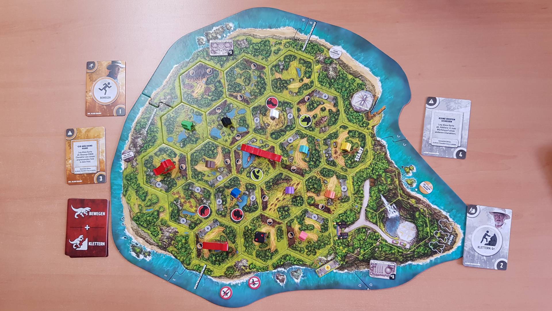 Willkommen im Jurassic Park! Die ersten Besucher sind angekommen, um die Dinosaurier zu sehen. Doch auf der Isla Nublar herrscht Chaos - der Strom ist ausgefallen, und die Kreaturen sind auf der Jagd! Ein Spieler steuert den T. Rex, den Dilophosaurus und den Velociraptor, die sich durch den Dschungel schleichen. Die anderen Spieler schlüpfen in die Rollen der Figuren aus dem Filmklassiker und versuchen, Jurassic Park wieder in Gang zu bringen und von der Insel zu fliehen! Dieses abenteuerliche Strategiespiel bietet viele Möglichkeiten - Zehn verschiedene Charaktere mit ihren eigenen, einzigartigen Zielen und ein modularer Isla Nublar-Spielplan ermöglichen einen hohen Wiederspielwert und variable Strategien. JAGE als Dinosaurier ... oder ÜBERLEBE als Mensch! Wenn ein Mensch von den Dinosauriern eliminiert wird, kommt dieser sofort mit einem brandneuen Charakter wieder ins Spiel. Wenn die Spieler eine bestimmte Anzahl von Menschen in Sicherheit bringen können, gewinnen die Menschen. Gelingt es dem Dinosaurier-Spieler jedoch, drei Menschen zu eliminieren, gewinnen die Dinosaurier. Nur wenn die Menschen gut zusammenarbeiten, schaffen die Spieler mit dem Hubschrauber zu entkommen!