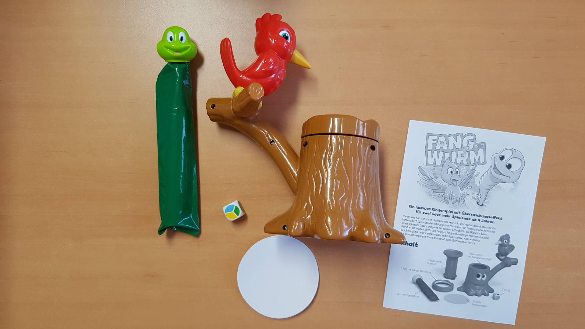 Nanu? Wer hat sich da im Baumstamm versteckt und wartet darauf, dass ihr ihn herauspickt? Das muss der witzige grüne Wurm sein. Ein hungriger Specht möchte einen schnellen Snack und pickt mit seinem Schnabel in den Baum. Wer dran ist, würfelt, dreht den farbigen Ring in die richtige Position und pickt beschwingt mit dem Vogelschnabel in die Papierdecke. Springt der Wurm dabei heraus, hast du gewonnen!