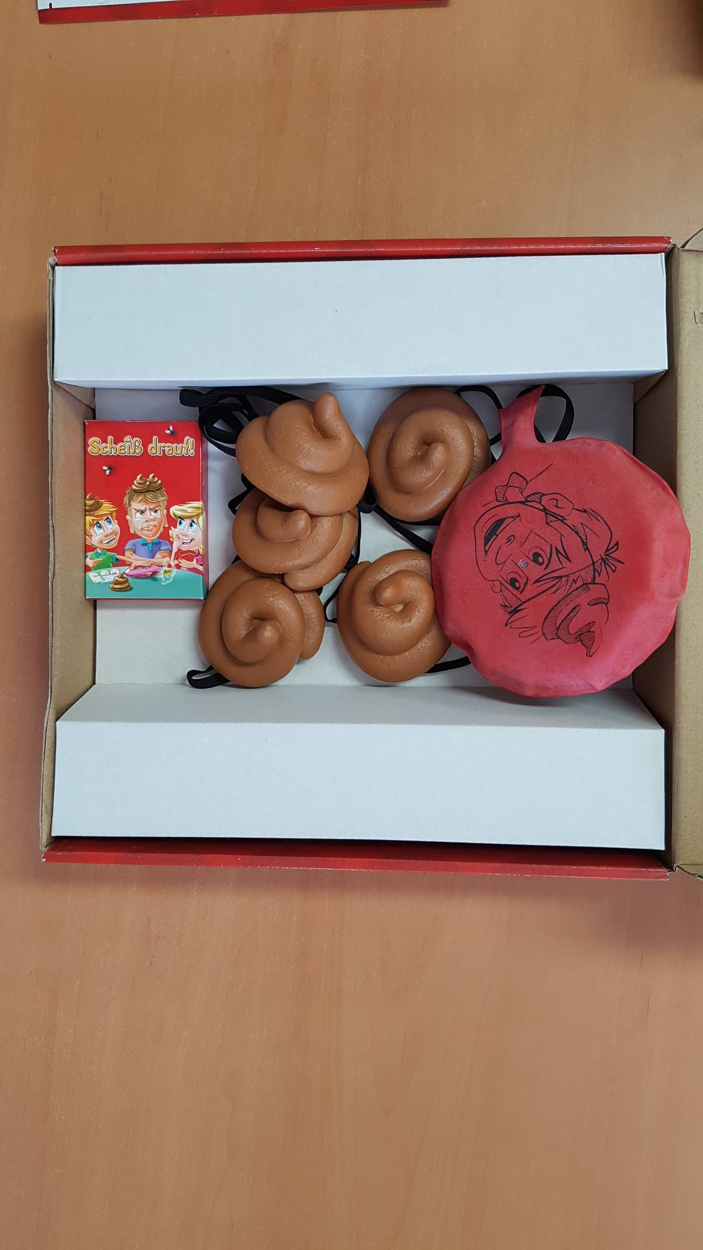 Bei Scheiß drauf! legen Spieler Karten auf einen gemeinsamen Stapel. Folgende Reihenfolge muss eingehalten werden: Toilette, Haufen, Klopapier, Hände waschen. Der langsamste Spieler muss einen Haufen auf den Kopf setzen.