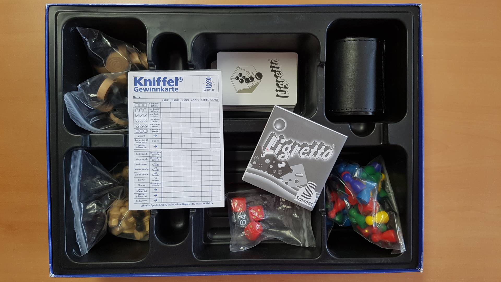 Diese Premium-Edition mit über 100 raffinierten Spielemöglichkeiten enthält neben den original Mensch-ärgere-Dich-nicht und Kniffel unser beliebtes Ligretto Kartenspiel. Zusammen mit vielen weiteren populären Spielen wie Backgammon und Halma sorgt das hochwertige Material – Würfelbecher aus Leder und Würfel aus Holz – für zahlreiche vergnügliche Spielerunden.