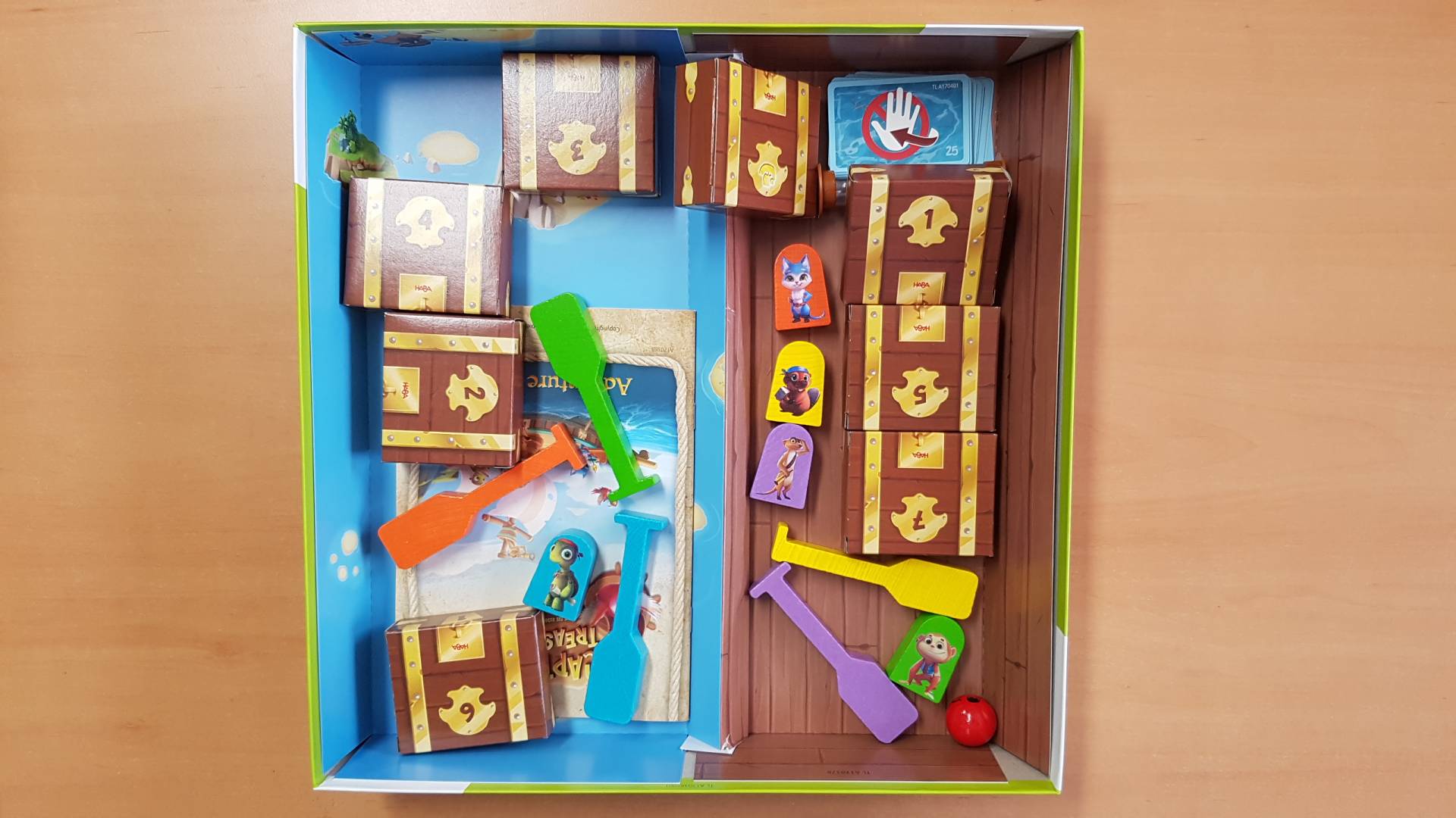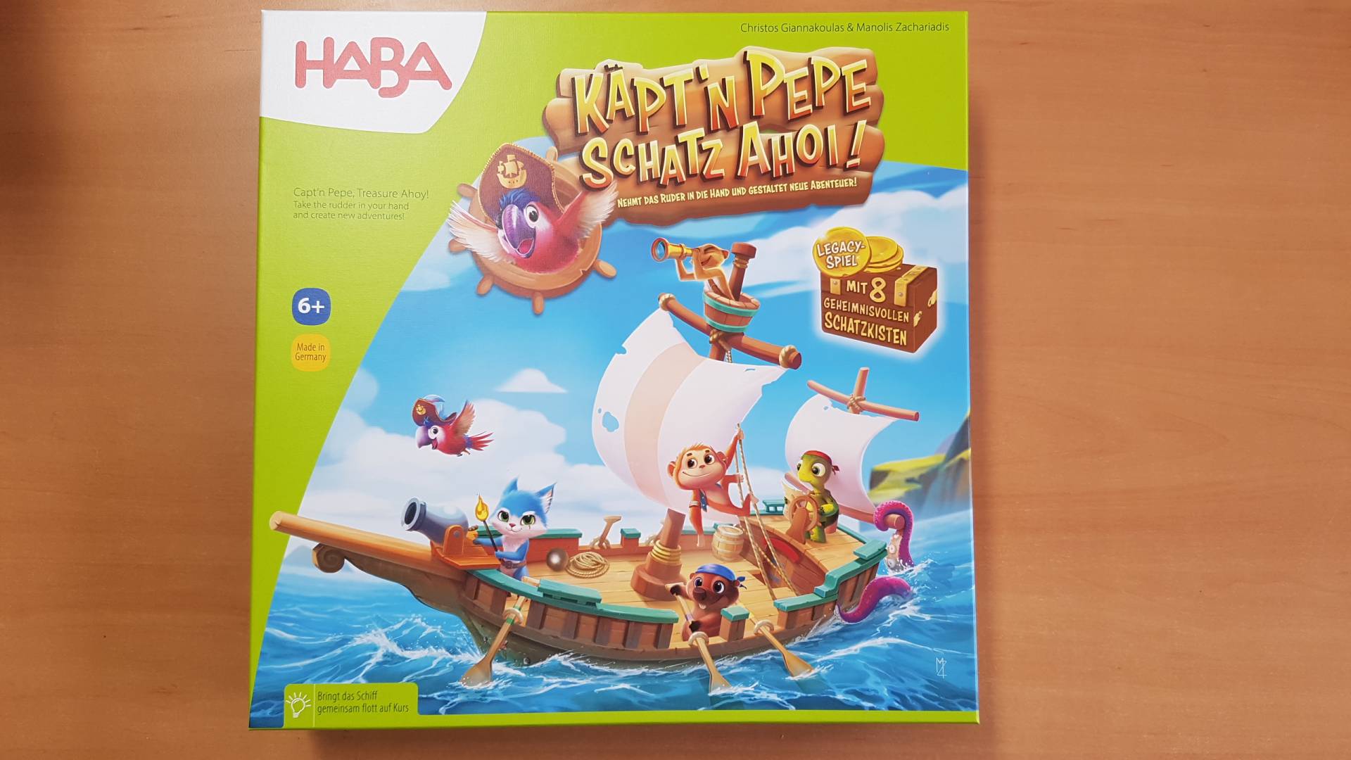 • piratenstarkes Spielmaterial: 3-D-Schiff, gefüllte Schatzkisten sowie hochwertige Crew-Figuren und Ruder aus Holz