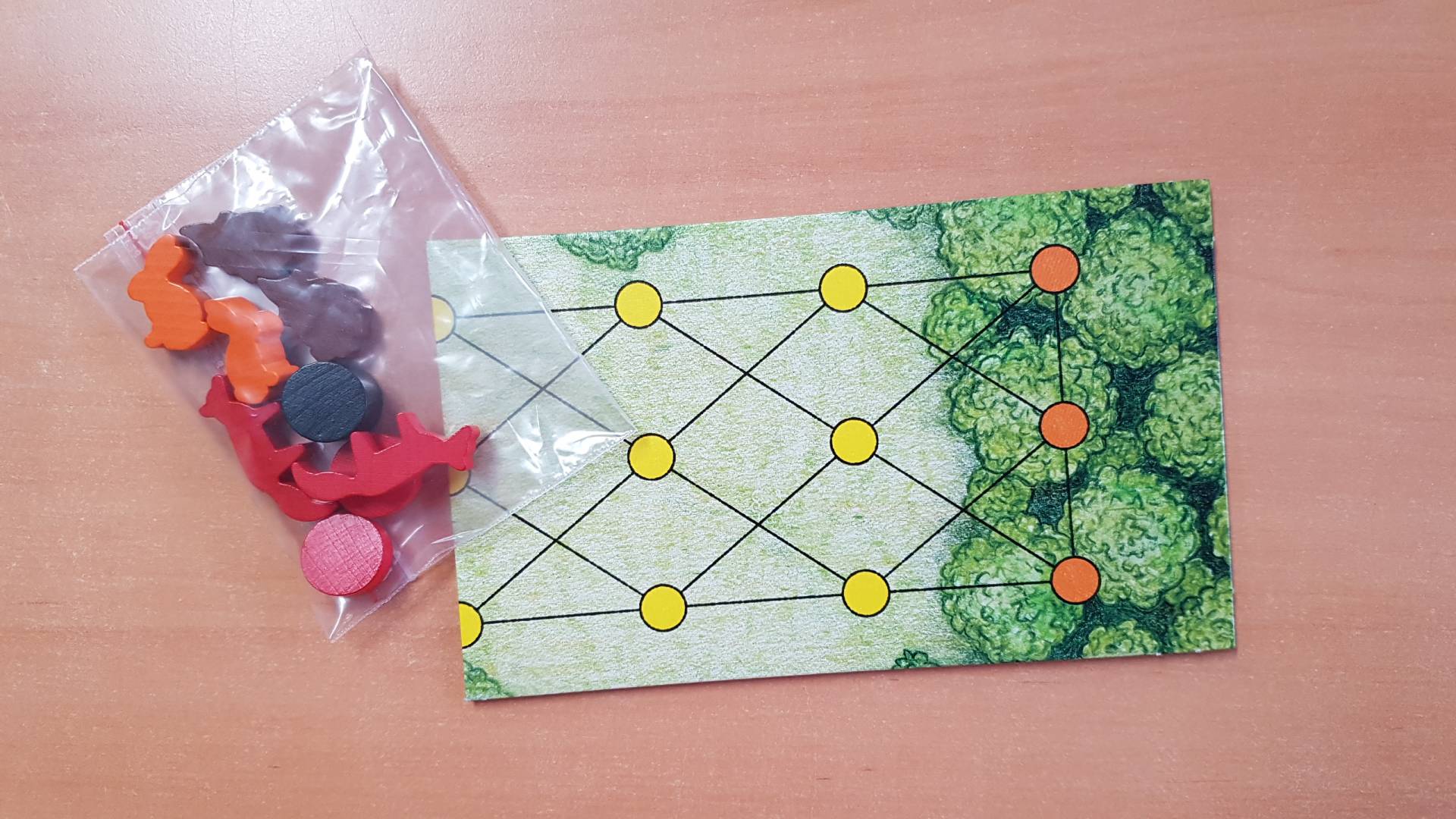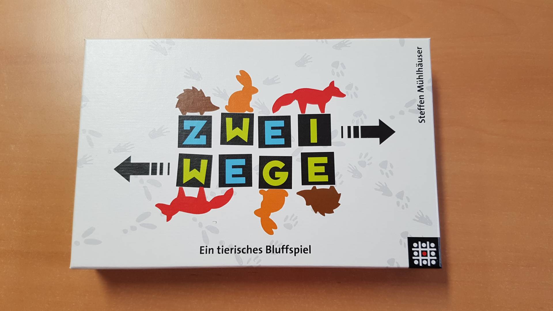 Zwei Wege ist ein lupenreines Bluffspiel. Die Spielenden haben die Aufgabe, ihre drei Tiere auf die andere Seite des Feldes zu bringen. Einziger Motor der Figuren: eine verdeckt gewählte Zugrichtung. Die Chancen auf ein Weiterkommen stehen 50:50, denn aus jeder Position gibt es genau zwei mögliche Wege zum nächsten Ziel und der Gegner darf nur einen verstellen. Ein spannendes „Katz & Maus“-Spiel für zwei Pokergesichter und ein Lehrstück in der Kunst des Bluffens!