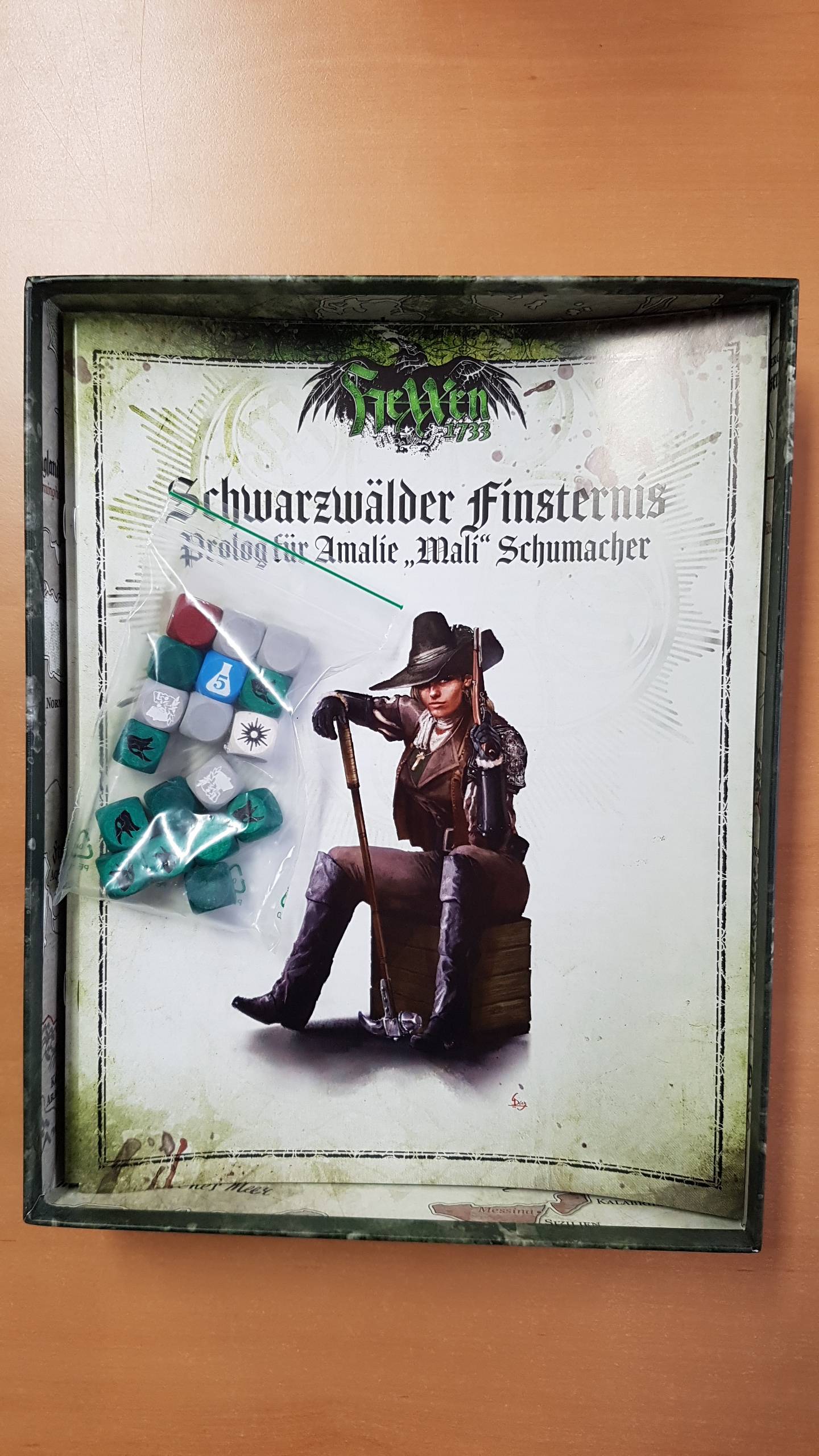 Die Spielbox enthält alles, was du brauchst, um spielend die Regeln zu erlernen und die Geschichte zu erleben. Dazu gehören vier Jägerprologe und Jägerbögen, ein Regelheft sowie eine Regelerklärung für die Spielleiterin, insgesamt vier Abenteuerhefte für die vier Gruppenabenteuer, eine doppelseitige Tischmatte, vier Jägermatten und jede Menge Pappmarker für alle Situationen. Auch das spezielle HeXXenwürfelset wird – diesmal erstmals aus Holz – der Box beiliegen!