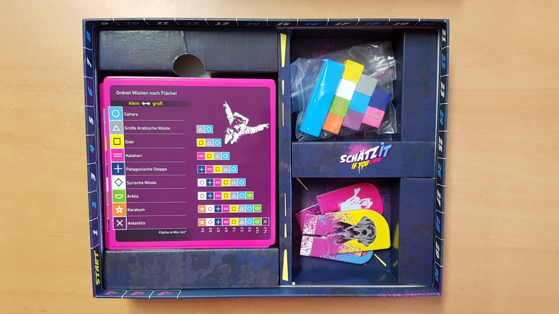 Dieses Spiel vereint außergewöhnliche Quizfragen mit Halbwissen und Bluffen. Denn bei „Schätz it – if you can“ gewinnt nicht, wer am meisten weiß, sondern wer am besten blufft. Spieler*innen, die am Zug sind, decken die Begriffe in der richtigen Reihenfolge auf. Der*die nächste Spieler*in bringt die Begriffe entweder in die richtige Reihenfolge oder segnet die Reihenfolge ab und deckt einen weiteren Begriff auf. Bei Anzweiflung werden die Antworten direkt kontrolliert.