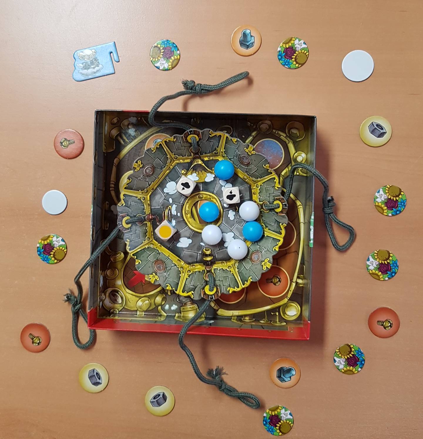 Legt den Schachteldeckel so auf den Tisch, dass ihr den Maschinenraum im Inneren sehen könnt. Mischt die Hagelplättchen und legt sie verdeckt auf die passenden Felder des Maschinenraums. Legt auf alle Felder außerdem je ein Blumenplättchen.