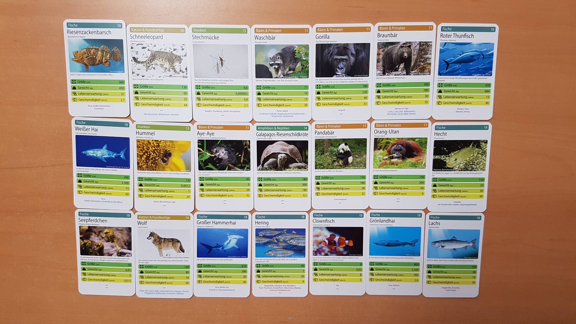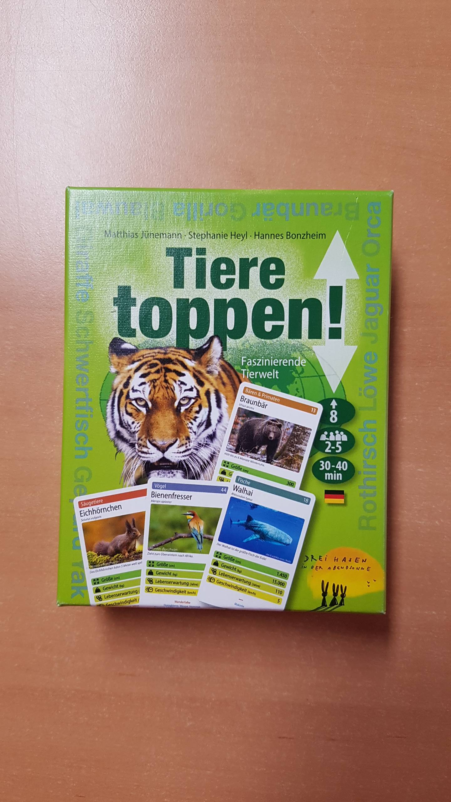 In diesem neuen Stich-Kartenspiel für 2-5 Spieler/Spielerinnen ab 8 Jahren staunt man über die abwechslungsreiche Tierwelt! Alle lernen durch ständiges Vergleichen der vier Kategorien „Größe“, „Gewicht“, „Lebensalter“ und „Geschwindigkeit“ die oft verblüffenden Maße und Merkmale der einzelnen Tiere kennen. Weil sowohl der höchste als auch der tiefste Wert stechen kann, ist es möglich, dass man in einer Kategorie etwa mit der Ameise gegen ein viel größeres Tier, wie beispielsweise der Katze, gewinnen kann (gleiches Spielprinzip wie bei den beiden ersten Spielen „Länder toppen“ und „Inseln toppen“). Doch Vorsicht, es gibt auch Fressfeinde, die innerhalb eines Stichs die Karten noch einmal neu mischen können …