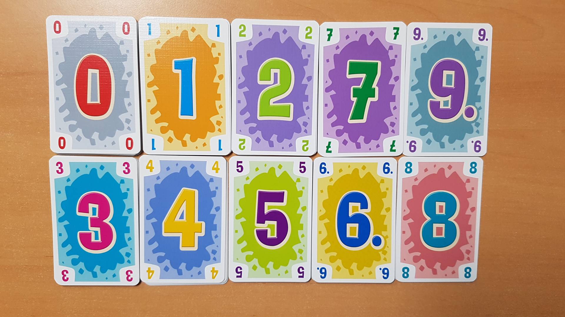 Wir haben 55 beidseitig bedruckte Karten mit den Zahlen von 0 bis 10. 7 Karten bekommt man auf die Hand und darf sich die Rückseiten nicht ansehen. Im Spiel versuchen wir dann die Zahlensumme unserer Hand zu minimieren.
