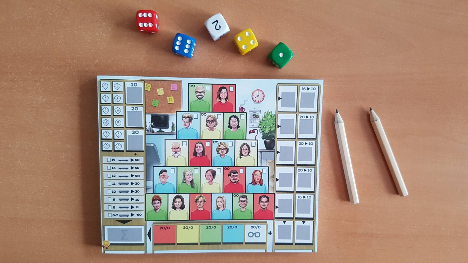 Das Leben eines Büroangestellten ist kein Zuckerschlecken! Täglich neue Fälle, langwierige Meetings, schwer zu erreichende KPIs, ständig drohende Deadlines - und zwischen all dem muss man auch noch Zeit für eine Tasse Kaffee finden und den neuesten Klatsch und Tratsch über Geschäftliches, Privates und natürlich über die anderen Kolleginnen und Kollegen austauschen. Du stehst also vor einer gewaltigen Aufgabe! In At The Office musst du die Arbeit deines gesamten Teams mit Rationalität, Intuition und Glück optimal organisieren. Deine Aufgabe ist es, über den Tellerrand hinauszuschauen und dein Team so zu führen, dass du möglichst viele Punkte sammelst und Chef des Jahres wirst. Schnapp dir Stifte und Würfel und leg los! At The Office ist ein Roll & Write-Spiel, bei dem der Würfel entscheidet, ob du dein Blatt mit den richtigen Werten füllst. Einerseits musst du deine Planungsfähigkeiten einsetzen, um dein Blatt so gut wie möglich auszufüllen, andererseits musst du dich auf das unberechenbare Schicksal verlassen, denn du weißt nie, wie die nächste Runde aussehen wird.