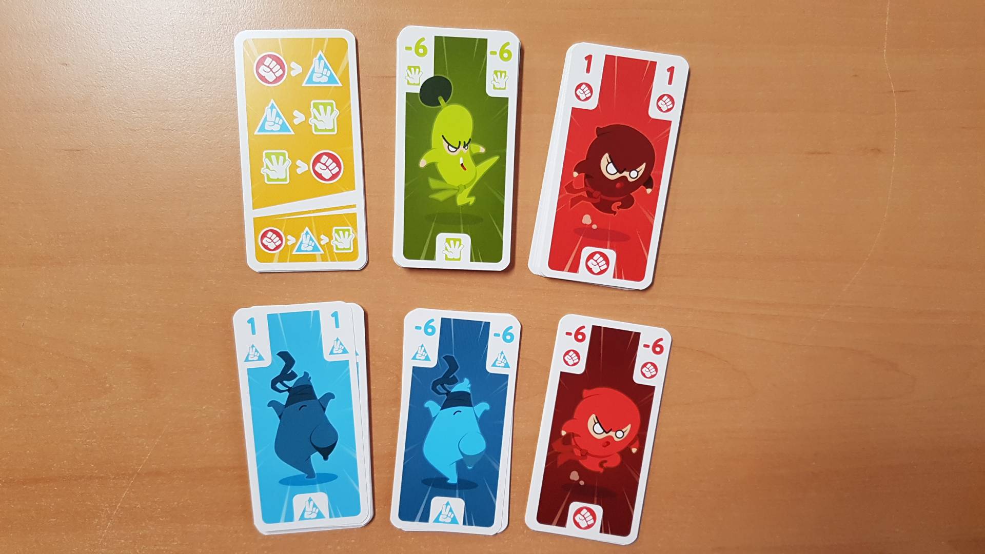Nimm einen Kartenstapel aus der Mitte des Tisches und wende die Regeln von Schere, Stein, Papier an. Deine Karte ersetzt diesen Stapel auf dem Tisch.