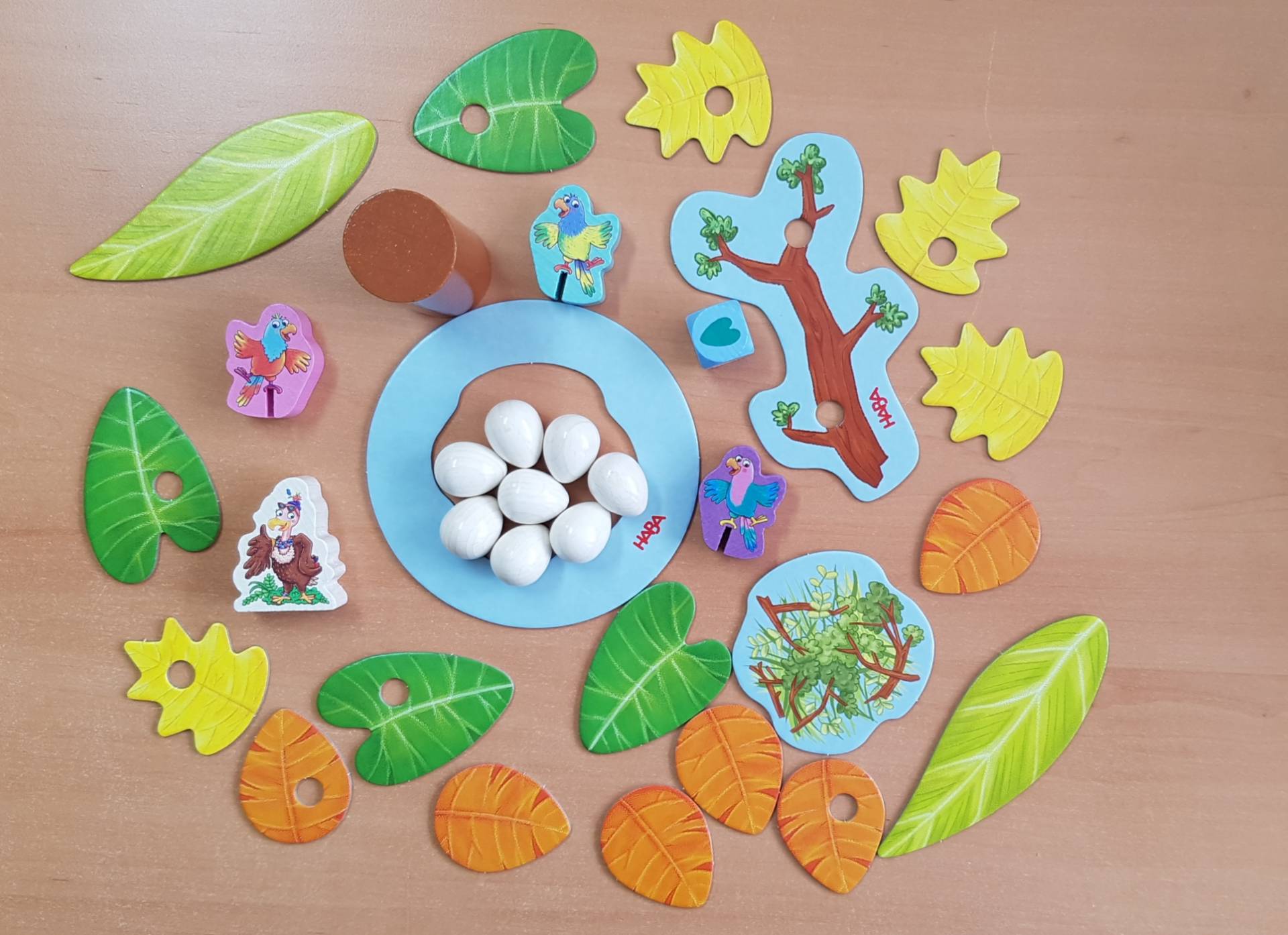 Es ist Zeit zum Eierlegen! Und Frau Geier ist besonders fleißig – gleich 8 große Eier sind es. Nur leider ist das Nest viel zu klein! Alle Kinder helfen gemeinsam, Frau Geier ein großes, stabiles Nest zu bauen. Doch die frechen Papageien warten nur darauf, dass etwas herunterfällt. Sind Frau Geier und ihre Eier im Nest eingezogen und das Nest hält, bevor sich der letzte Papagei breit macht, haben alle gemeinsam gewonnen.