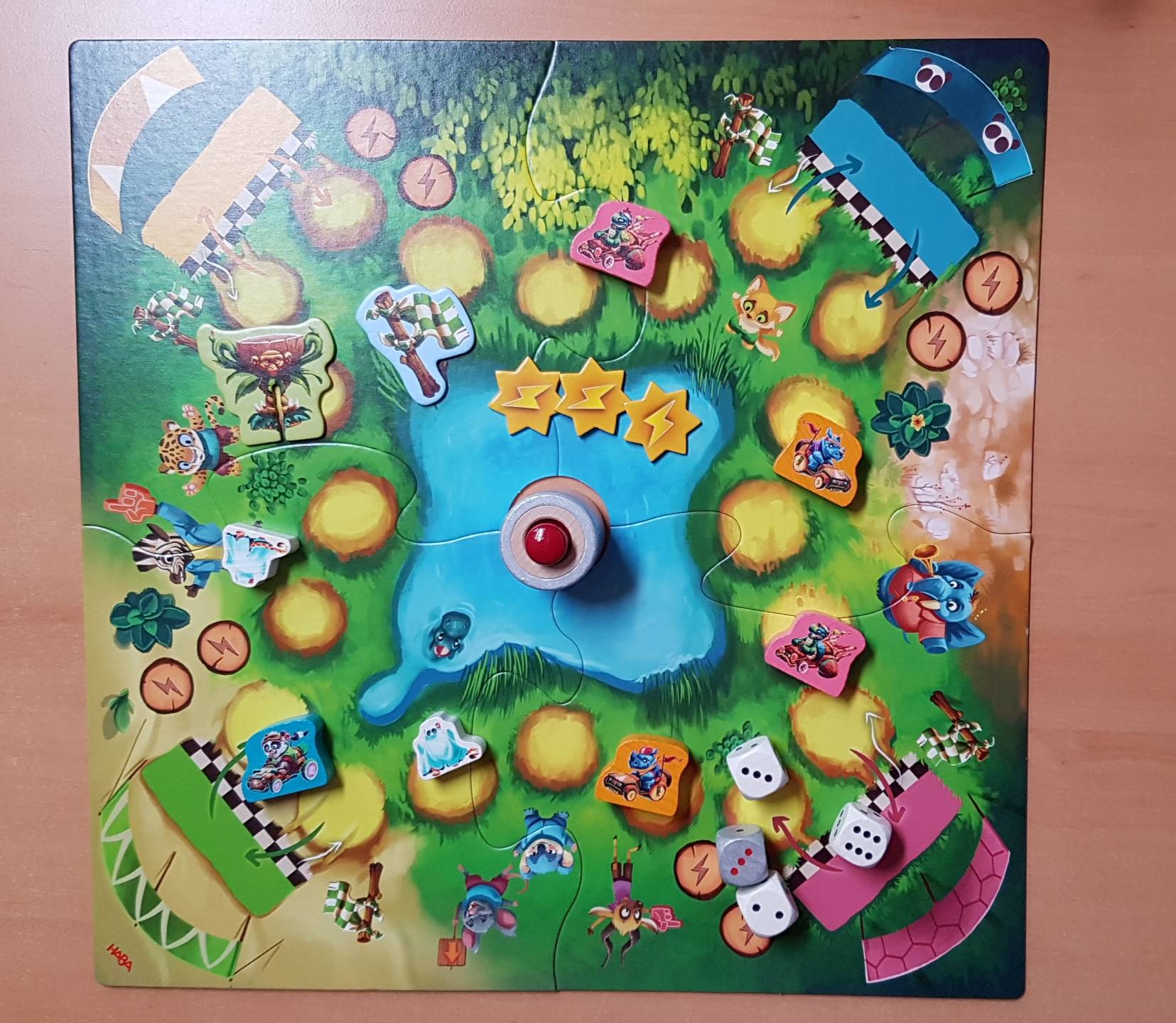 Welches tierische Team gewinnt die spektakuläre Seifenkisten-Rallye durch den Dschungel und umrundet zuerst dreimal die Holperpiste? Wer blitzschnell die Hupe drückt, kann die gegnerischen Würfel für sich nutzen und kommt schneller voran. Doch aufgepasst: Die Pistengespenster schicken die Tiere zurück an den Start. Da heißt es: Nicht ärgern, sondern mit Taktik und Würfelgeschick ins Ziel düsen!