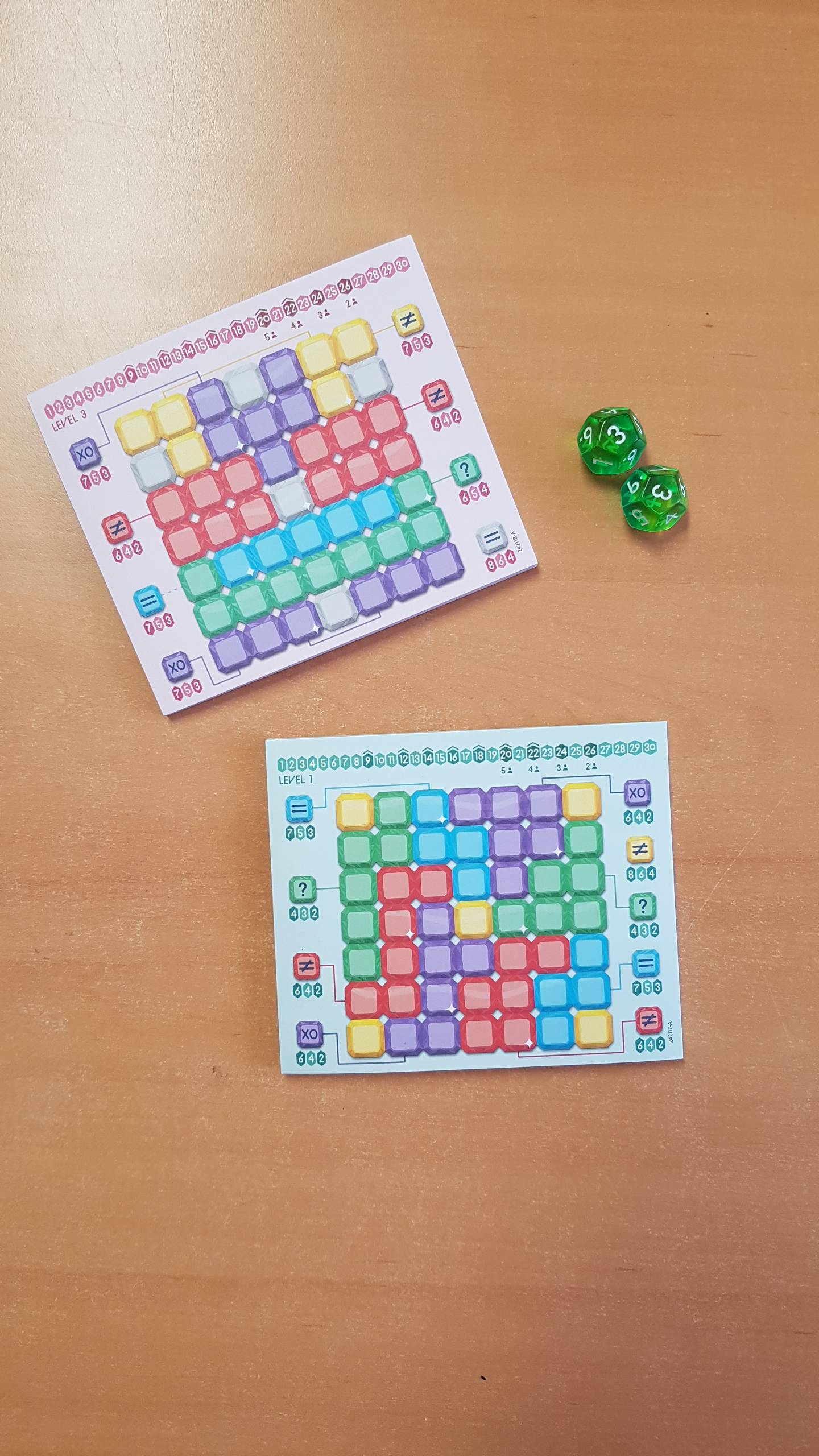 Von zwei gewürfelten Zahlen muss eine der beiden neben die andere (bereits eingetragene Zahl) eingetragen werden. Auf diese Weise füllt sich dein Blockblatt und die jeweiligen farbigen Edelsteingebiete. Dabei musst du bestimmte Vorgaben einhalten. Manchmal dürfen es nur (un)gerade Zahlen sein, manchmal zwei verschiedene Zahlen. Es gibt auch Edelsteingebiete in denen immer nur die gleiche Zahl eingetragen werden darf. Da sich dein Blockblatt immer weiter füllt, wird das Ausfüllen der Edelsteingebiete Runde um Runde immer kniffliger.