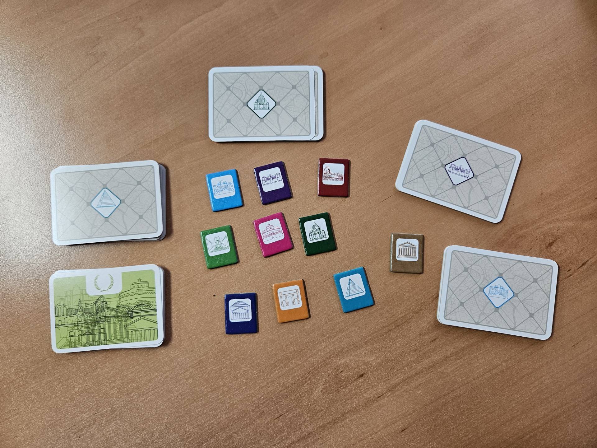 Alle Wege führen nach Rom … und zu Petersdom, Forum Romanum et cetera! Ihr seid gemeinsam als Stadtplaner im Einsatz. Eure Aufgabe ist es, die im 7x7-Raster ausliegenden Karten so zu platzieren, dass am Ende die 10 Sehenswürdigkeiten aus allen 4 Himmelsrichtungen mit ihren Straßen verbunden sind. Wer an der Reihe ist, tauscht jeweils die offene Handkarte gegen eine verdeckt ausliegende Karte. Diese wird dann zur nächsten Tauschkarte. Zusätzlich zu den Richtungsvorgaben gibt es verschiedene Bauvorgaben für einzelne Spalten und Reihen. Diese variieren von Partie zu Partie. Damit könnt ihr Rom immer wieder neu erbauen und das Spiel zunehmend schwieriger gestalten.