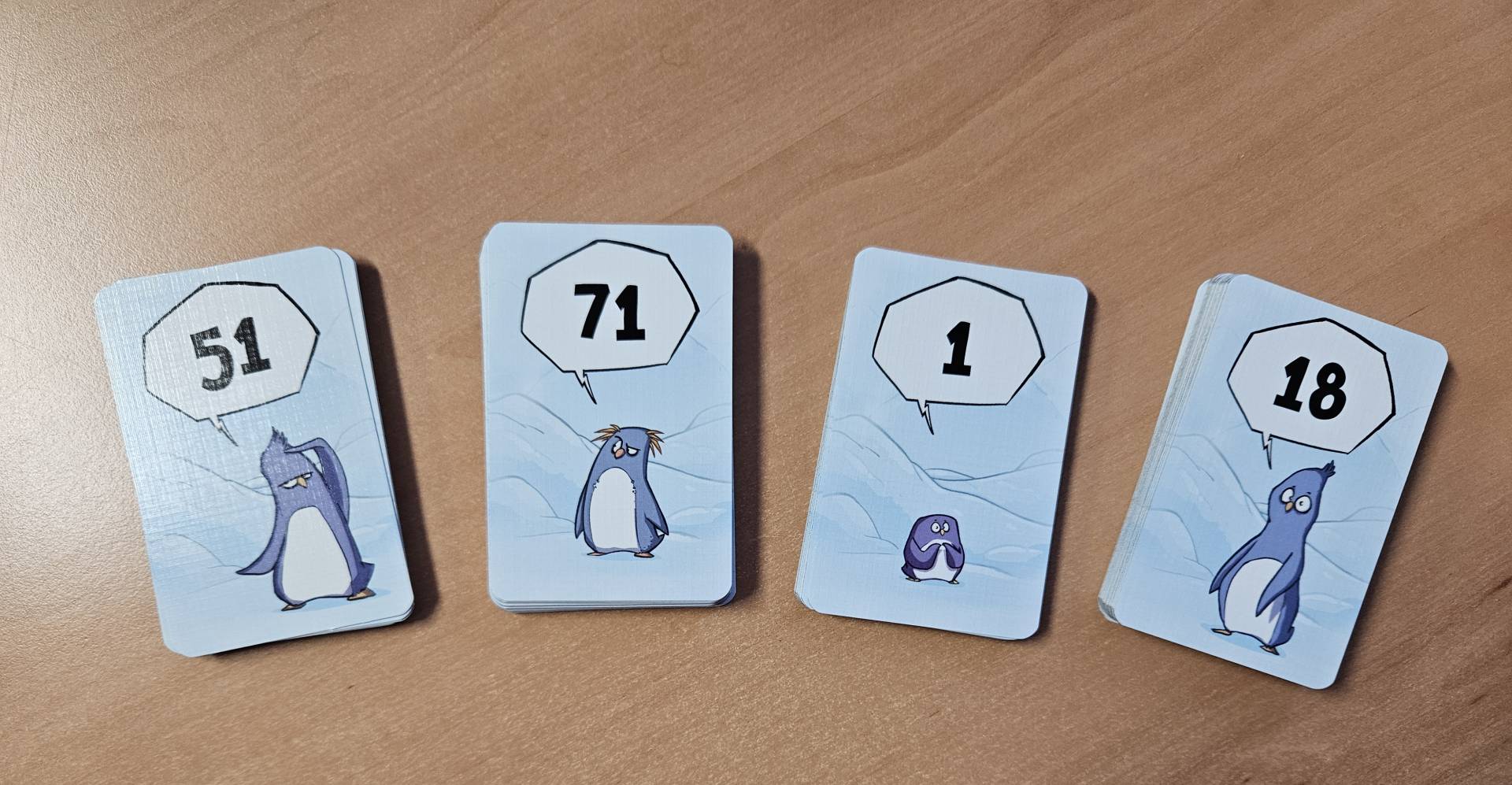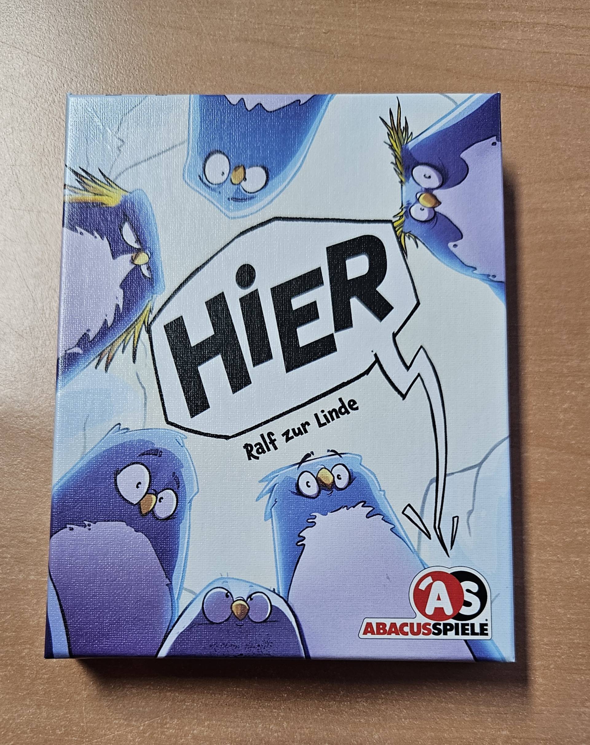 „HIER!“ – „HIER!“ – „HIER!“ hört man es überall in der großen Pinguinkolonie schreien. Denn die Pinguine suchen ihre Partner. Der richtige Partner ist immer derjenige Pinguin, dessen ausgerufene Zahl so nah wie möglich an der eigenen Zahl liegt. In diesem Reaktionsspiel versucht ihr, so schnell wie möglich für Pinguine die richtigen Partner zu finden. Wer zuerst die eigenen 5 Pinguine loswird, gewinnt HIER