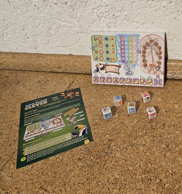 Für AUCH-SCHON-CLEVER-Fans und alle, die es werden wollen. Im Dschungel ist so einiges los! Schmetterlingstanz, Kokosnüsse jonglieren, Bananen pflücken und zu guter Letzt sprüht der Elefant noch eine bunte Wasserfontäne. Würfelt, kreuzt die Symbole clever an und ergattert Regenbogensterne und im besten Fall Zusatzzüge. Alle übrigen Würfel dürfen die Mitspielenden verwenden. So sind alle immer dabei und niemand muss lange warten.
