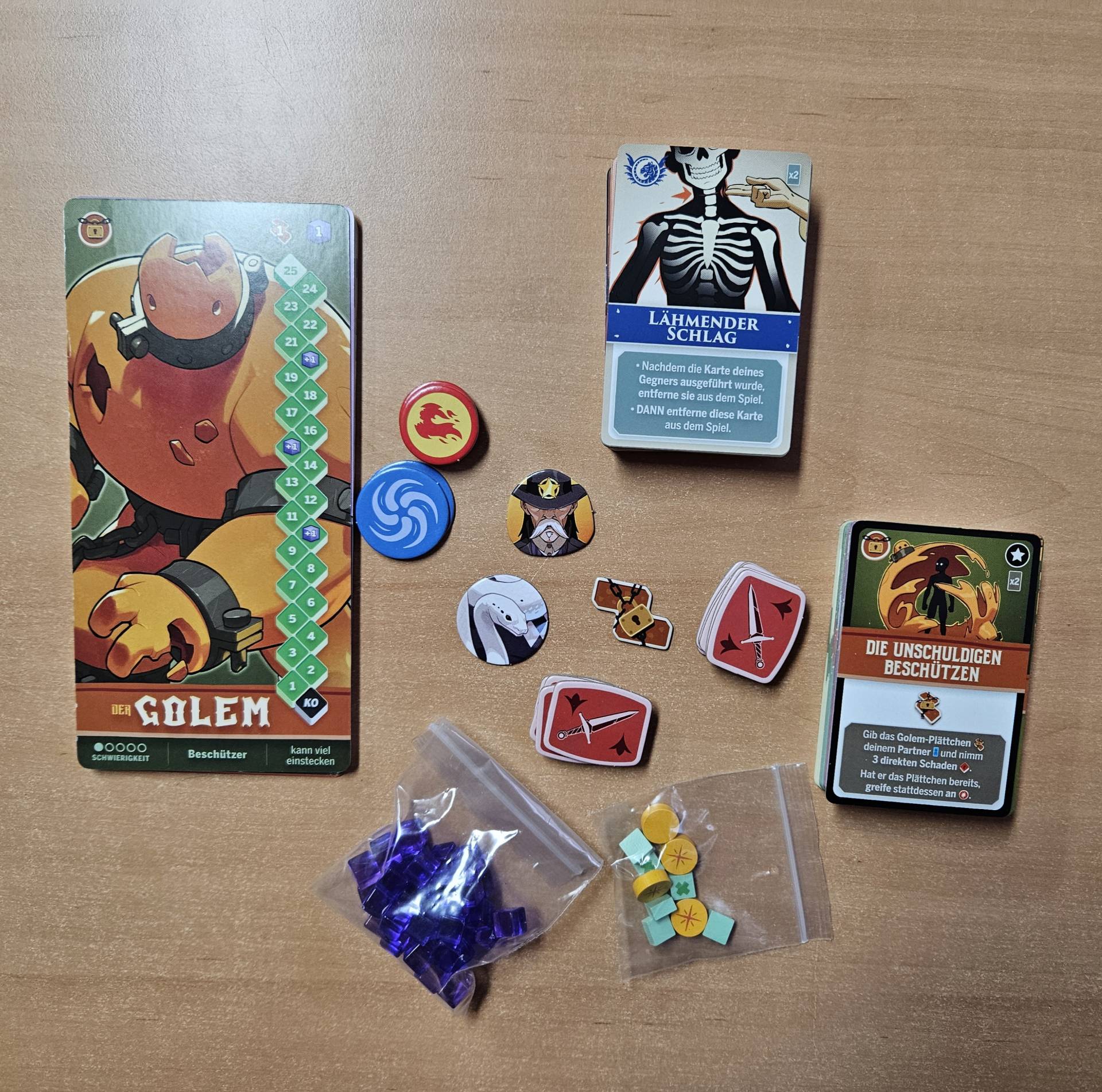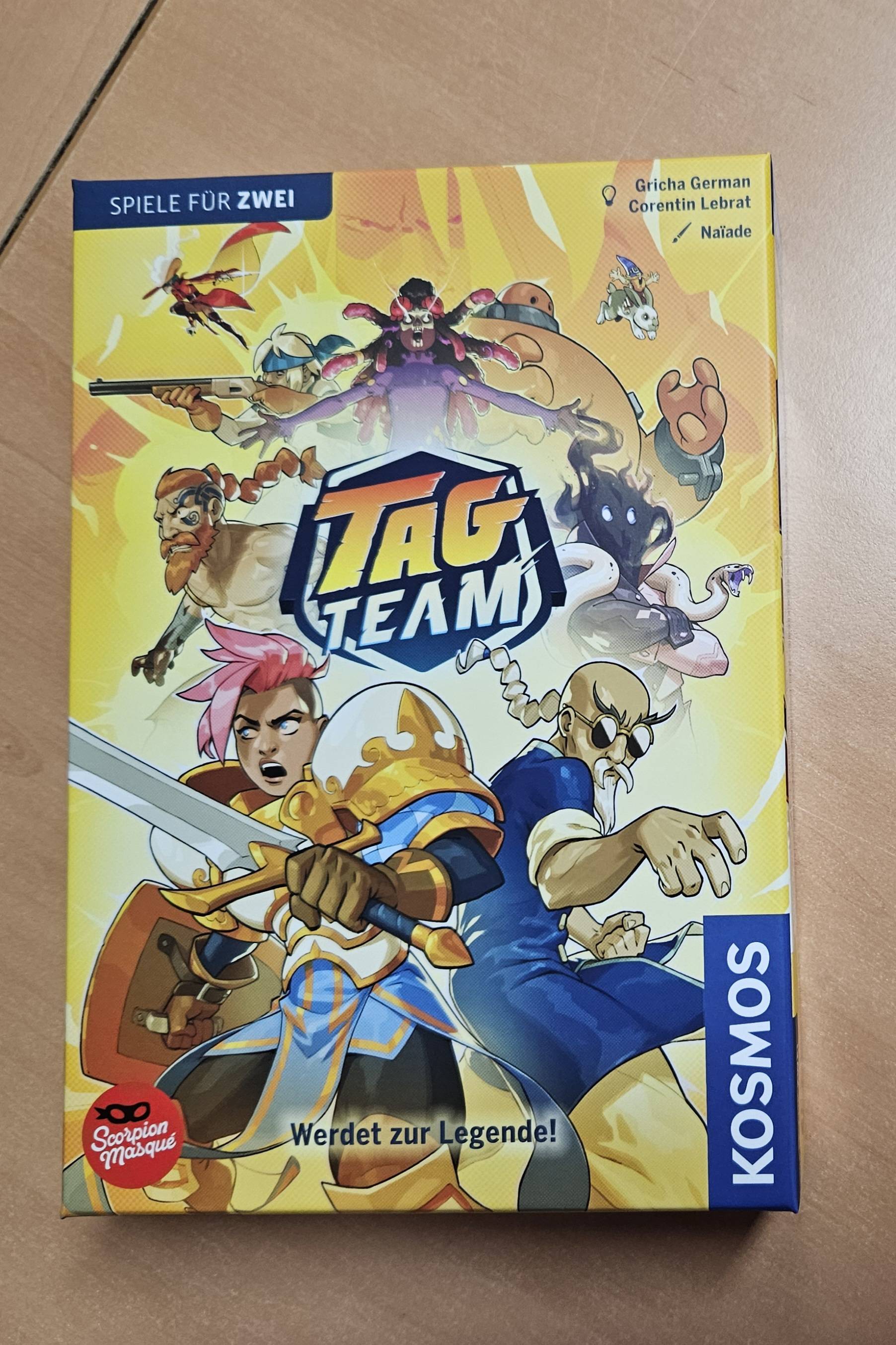 Auf in den Ring: Welches Tag Team gewinnt das Duell? Im spannenden 2er-Spiel stellen sich die beiden Spielerinnen und Spieler je ein Tag Team aus zwei Kämpferinnen und Känpfern zusammen. Mit deren kombinierten Kartendecks treten sie Runde für Runde gegeneinander an, indem immer die oberste Karte aufgedeckt und die Effekte ausgelöst werden. Autobattler mit einfachen Regeln und Twist erleben: In jeder Runde wird dem Deck gezielt eine neue Karte hinzugefügt. Die Reihenfolge der Karten wird dafür nicht durchgemischt. Welche Karten treten jetzt wohl gegeneinander an? Das eigene Deck optimieren, die Karten des Gegenübers einschätzen und Angriffe möglichst gekonnt blockieren: ein lustiges Duellspiel ab zehn Jahren mit überraschenden Wendungen und großem Wiederspielreiz durch 12 individuelle Kämpferinnen und Kämpfer!