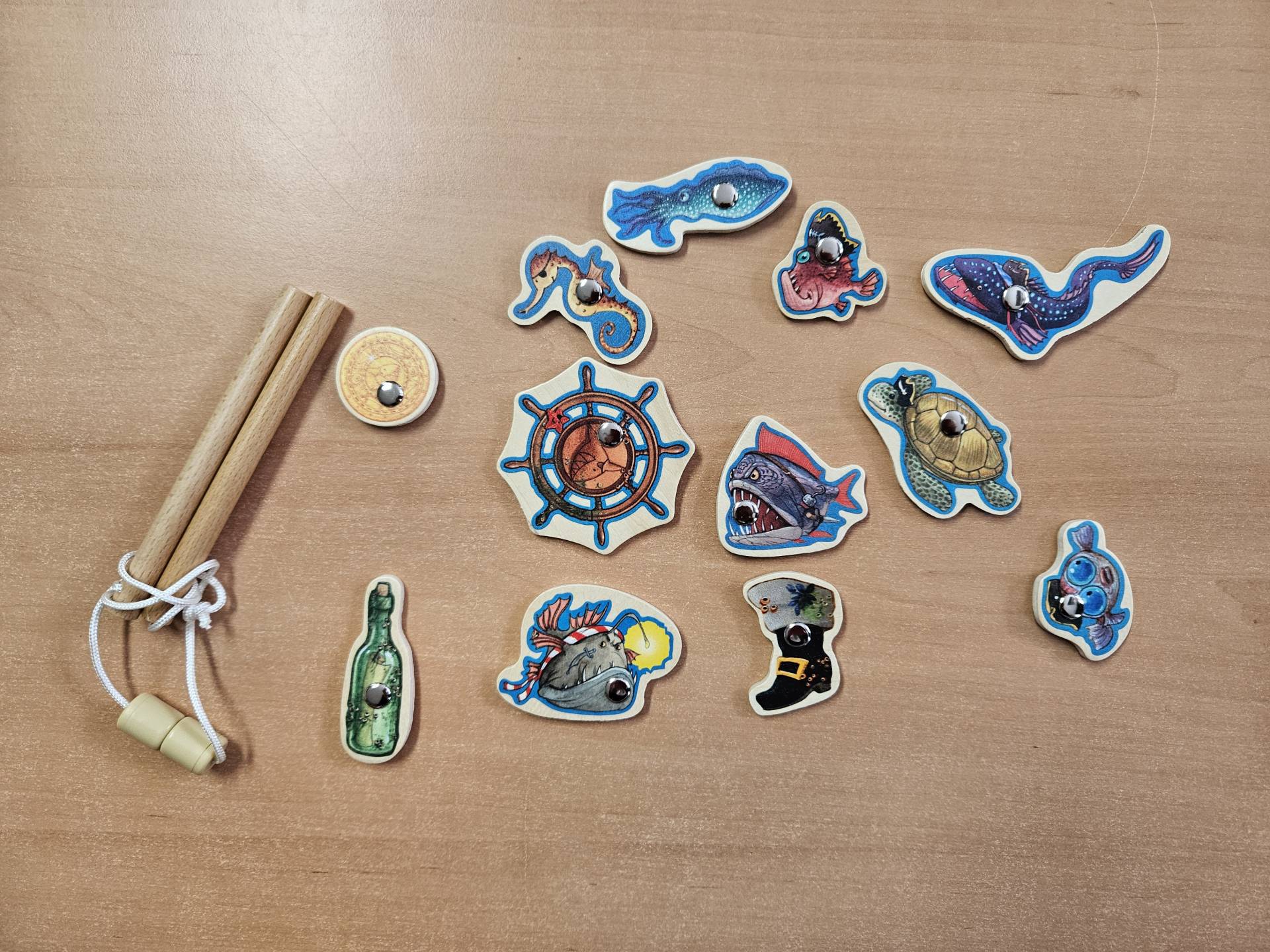 Piraten aufgepasst: Wer angelt den größten Fisch aus dem Wasser? Inhalt: 2 magnetische Angeln, 16 Fische in verschiedenen Größen und eine Anleitung. Toller Spielspaß für alle Fans von Käpt`n Sharky!