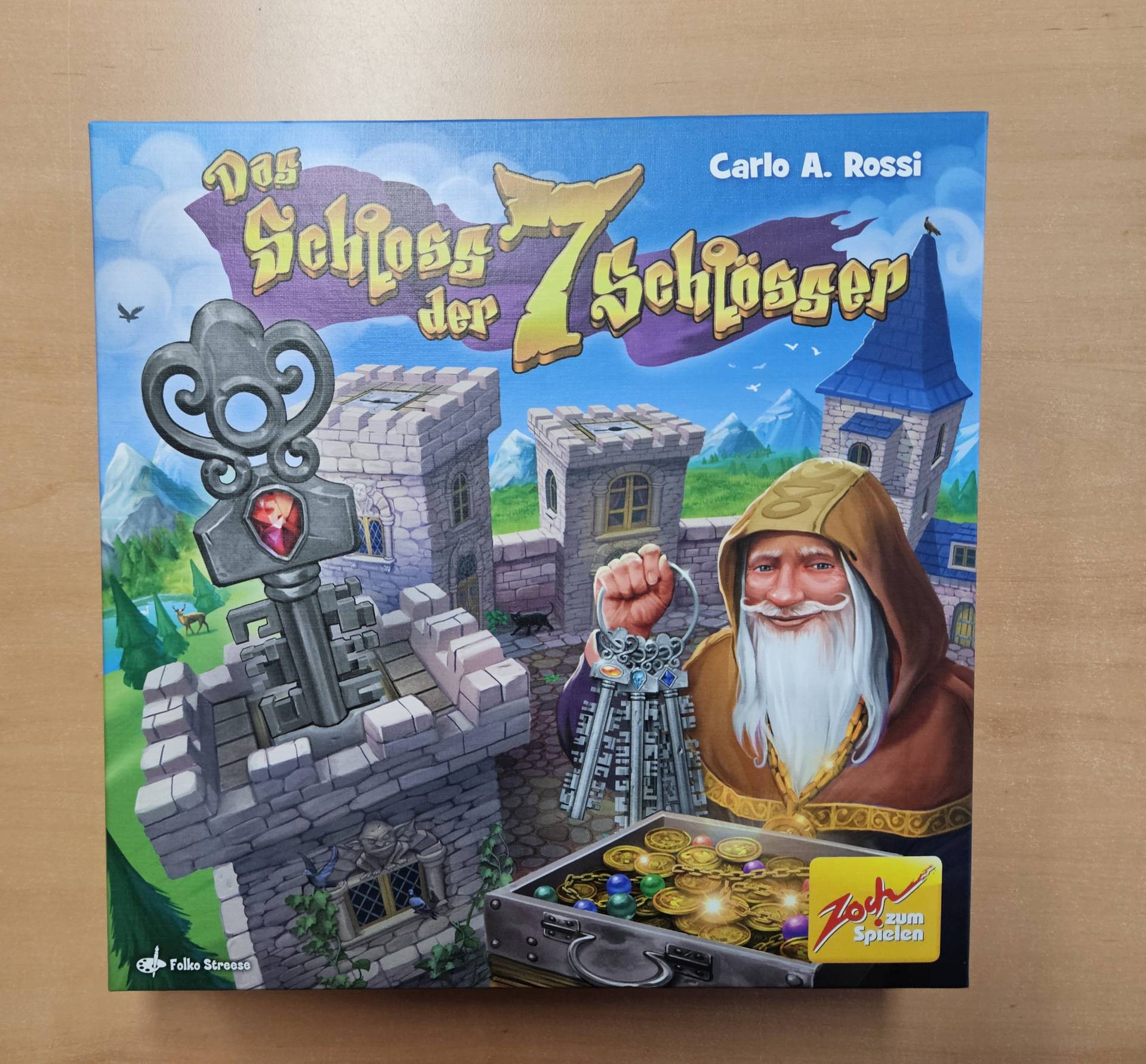 7 Schlösser wollen geöffnet sein...mit 8 Schlüsseln. Auf dem erhöht ausliegenden Spielplan dreht der alte Schlossmeister seine Runden. Er schreitet von einem Schlossturm zum nächsten, um sich stets den einzig passenden Schlüssel reichen zu lassen. Nur wer herausfindet, wie tief die einzelnen Schlösser sind, vermag sie zu öffnen, um den Schatzkammer die königlichen Perlen zu entlocken.