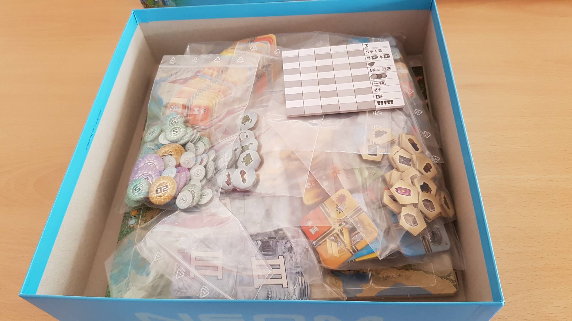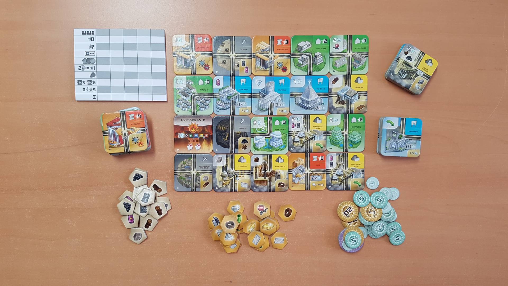 Zu Spielbeginn starten alle Spielerinnen und Spieler mit einem fast leeren Stadtplan, auf dem nur eine einzelne Industrie abgebildet ist der Ursprung. Dank diesem Ursprung können die Städteplaner/innen immerhin schon auf eine Ressource zurückgreifen um mit dem Bau der Stadt zu beginnen. Zusätzlich erhalten alle in einer Vorbereitungsphase drei Ankergebäude. Diese besondern Gebäude geben große Vorteile im Spielverlauf oder viele Siegpunkte am Spielende. Danach werden drei Generationen gespielt, die zwar nach dem gleichen Schema ablaufen, aber natürlich unterschiedliche Gebäude ins Spiel bringen. Zu Beginn erhalten dabei alle Spielerinnen und Spieler 8 Plättchen der aktuellen Generation auf die Hand. In klassischer Drafting-Manier wählen alle eines der Plättchen aus um mit diesem eine von drei möglichen Aktionen auszuführen, z. B. das ausgewählte Plättchen zu bauen. Danach werden die verbliebenen Plättchen an die Nachbarin / den Nachbarn weitergegeben. Je nachdem welches und wie bzw. wo das Plättchen verbaut wird schalten die Spielerinnen und Spieler so weitere Ressourcen oder andere Vorteile für ihre Stadt frei. Es gibt aber nicht nur Gebäude für die Stadt. Auch Katastrophen können durch die Spieler ausgelöst werden. Wohl dem, der eine Feuerwehr zur Abwehr der Feuersbrunst gebaut hat! Das Spiel endet nachdem die dritte Generation abgeschlossen ist. Danach werden die Städte aller Mitspielerinnen und Mitspieler bewertet und die Stadt mit der höchsten Punktzahl heißt ab dann NEOM - Die Stadt der Zukunft!