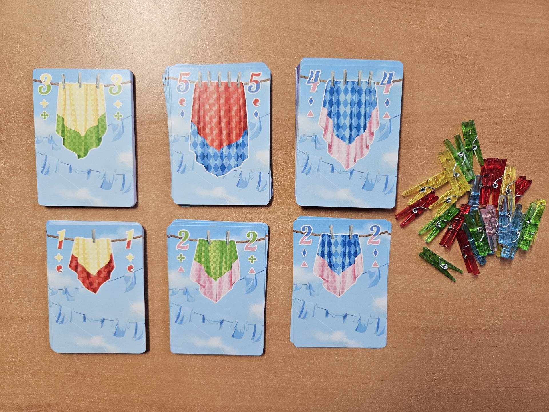 Die Karten so auf der Hand halten, dass nur die anderen die Vorderseiten der eigenen Karten sehen. Dann durch geschicktes Anstecken der farbigen Wäscheklammern auf die Karten Hinweise geben. Nur so gelingt es in diesem kooperativen Deduktionsspiel, gemeinsam möglichst viele Aufträge zu erfüllen.