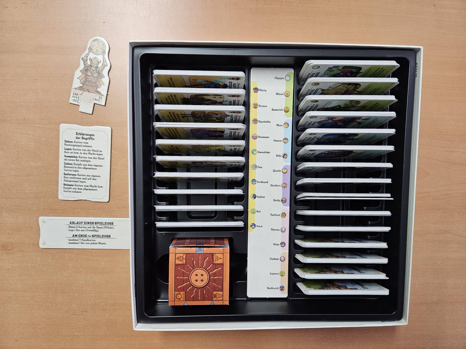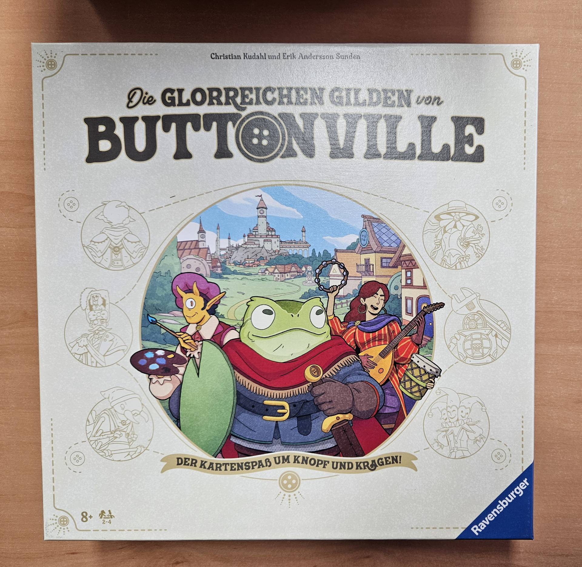 Die Glorreichen Gilden von Buttonville ist ein Kartenspiel für 2 bis 4 Spieler ab 8 Jahren. Rekrutiere so viele Dorfbewohner wie möglich und nutze deren Fähigkeiten. In deinem Zug rekrutierst du 2 Dorfbewohner vom Markt oder vom Nachziehstapel und dann kannst du mehrere Karten desselben Dorfbewohners spielen, die ein Set bilden. Die meisten Dorfbewohner haben unglaubliche Fähigkeiten. Manchmal wird die Wirkung stärker, je mehr identische Dorfbewohner du im Set spielst. Am Ende bringt dir jedes Set Dorfbewohner-Siegespunkte, basierend auf der Anzahl der Dorfbewohner in jedem deiner Sets. Spiele deine Karten geschickt, um das Spiel zu gewinnen!