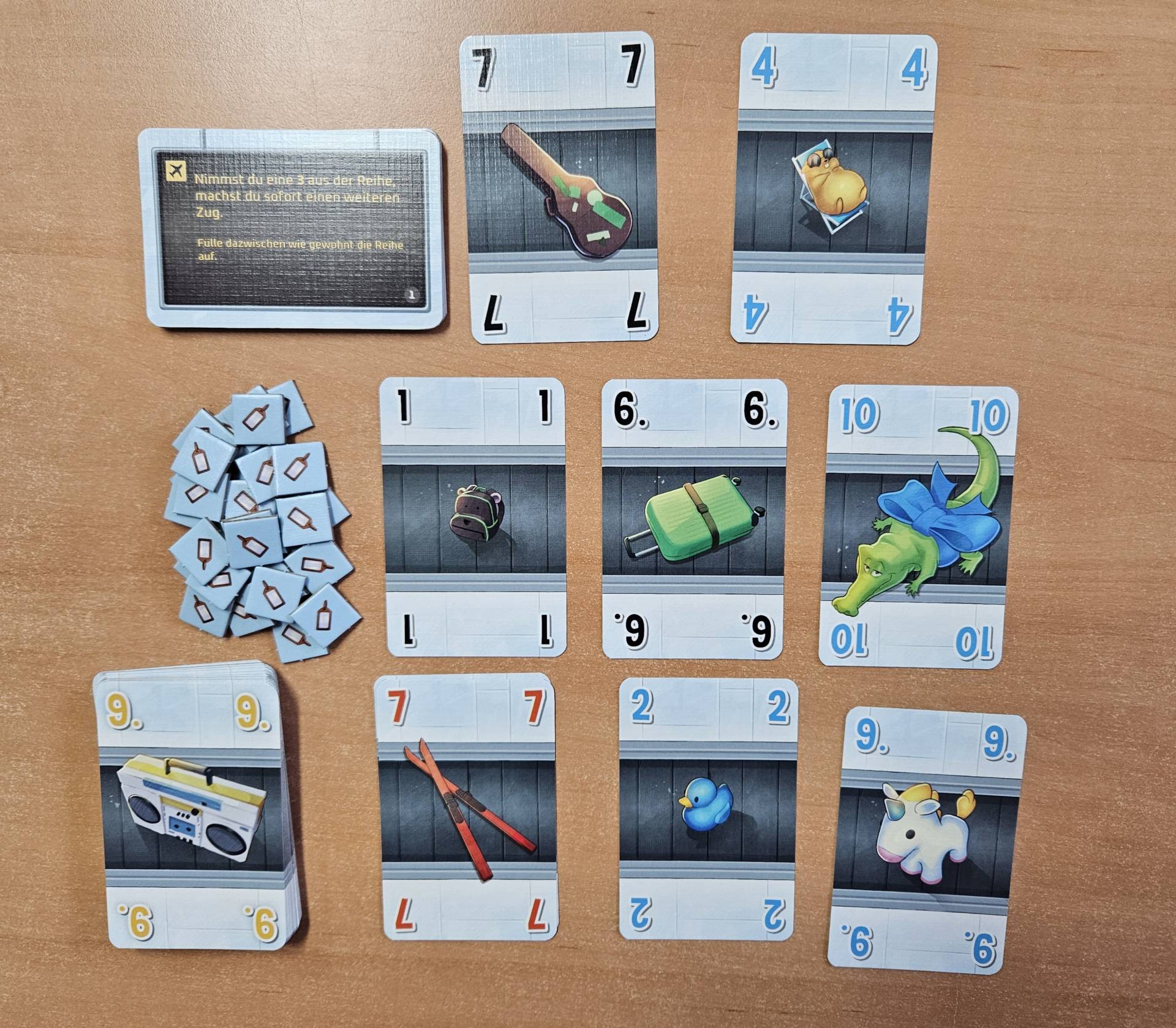 Was ist da los? Neben Koffern und Taschen liegen auf dem Gepäckband auch ein Krokodil und ein Kaktus?! Achso, Oma Hilde war mal wieder in Urlaub und hat so allerlei mitgebracht. Nun muss sie die wilde Mischung aus Gepäck, Ausrüstung und Souvenirs allerdings wohlgeordnet vom Band kriegen. Hier ist Unterstützung gefragt! Es gilt, möglichst viele Gepäckstücke nach Größe und Farbe sortiert zu sammeln, um die meisten Punkte zu machen. Wem das am besten gelingt, gewinnt nicht nur Oma Hildes Dankbarkeit, sondern auch dieses raffinierte Kartenspiel.