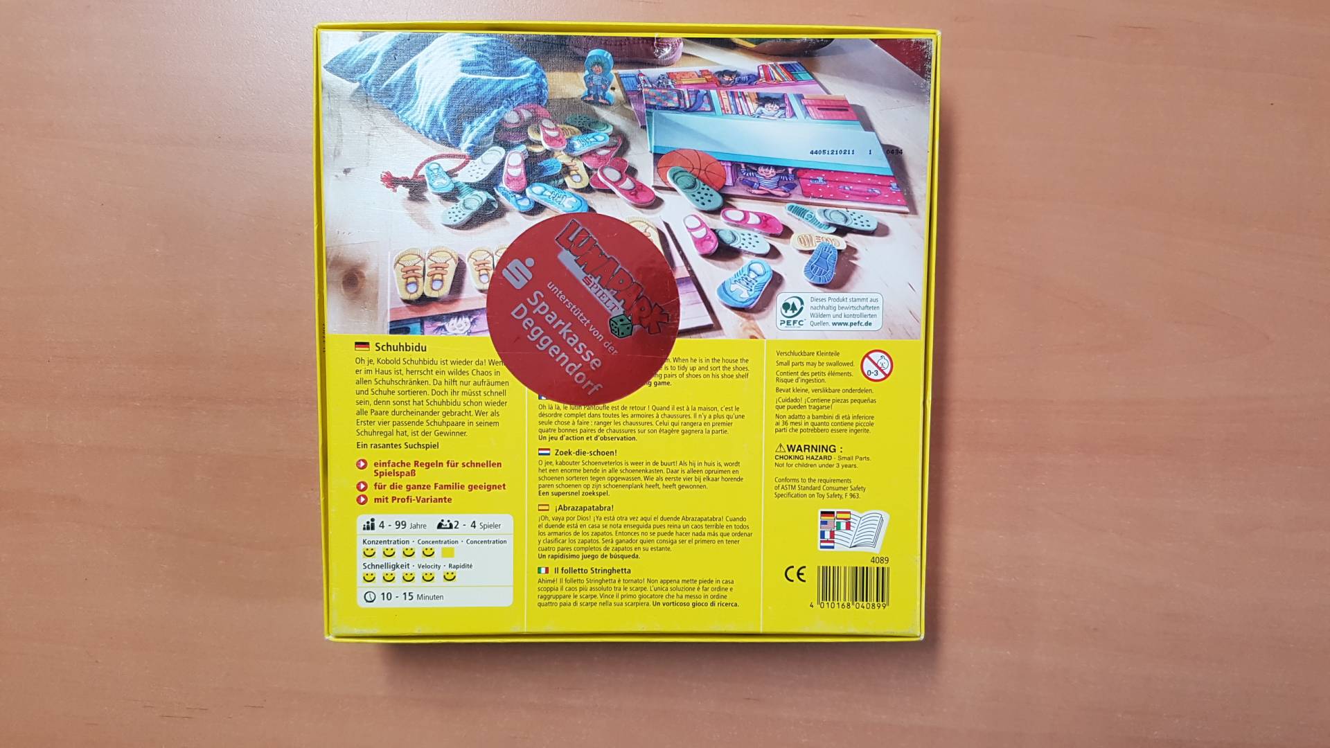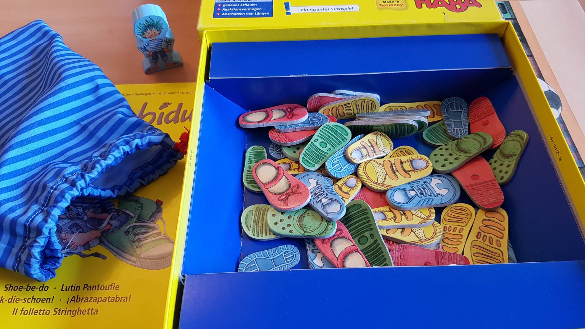 Oh je, Kobold Schuhbidu ist wieder da! Wenn er im Haus ist, herrscht ein wildes Chaos in allen Schuhschränken. Da hilft nur aufräumen und Schuhe sortieren. Doch ihr müsst schnell sein, denn sonst hat Schuhbidu schon wieder alle Paare durcheinandergebracht. Wer als Erster vier passende Schuhpaare in seinem Schuhregal hat, ist der Gewinner. Ein rasantes Suchspiel für 2 – 4 Spieler von 4 – 99 Jahren.
