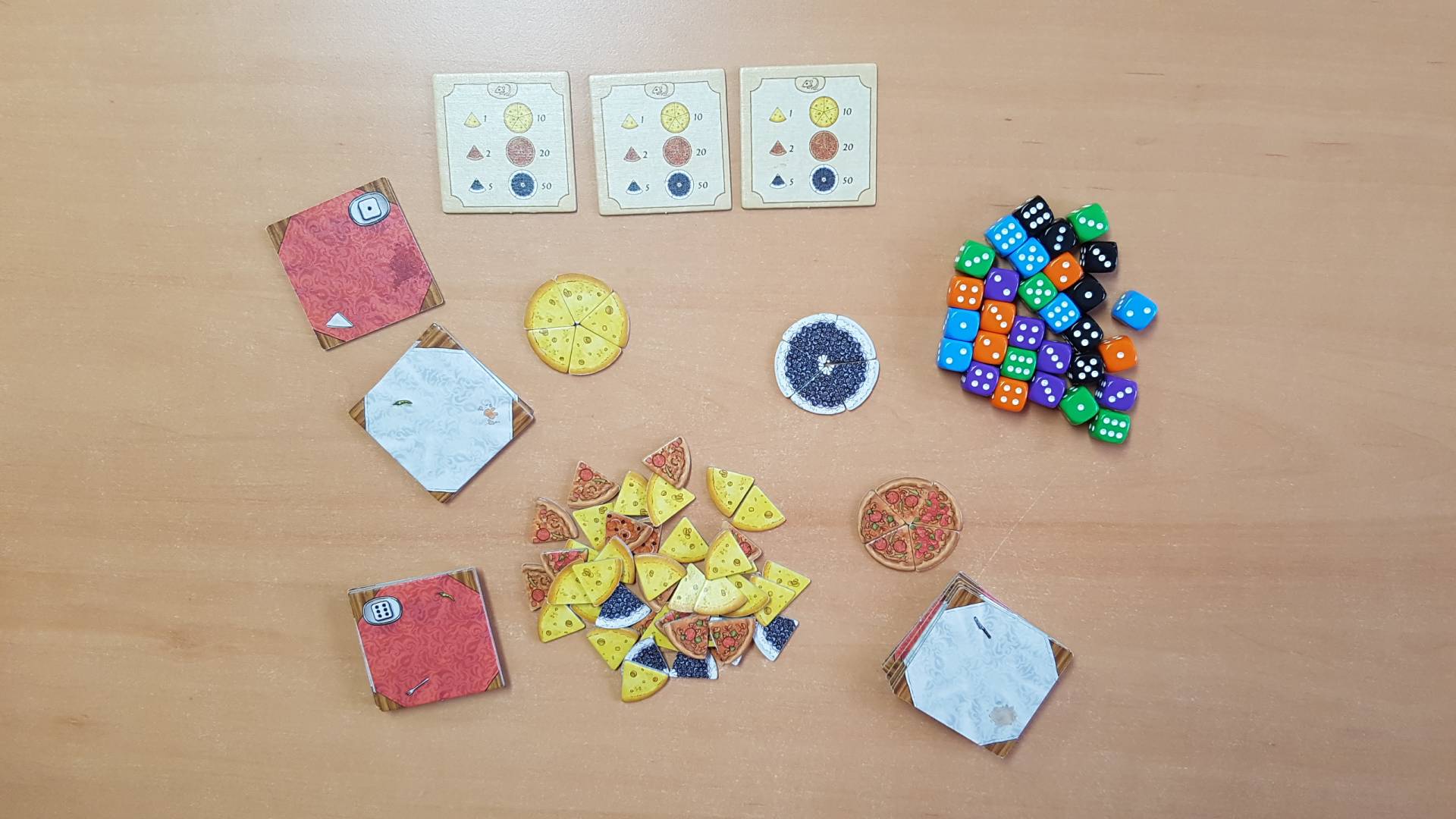 Auf den eigenen Teller packen darf die schmackhaften Happen aber nur, wer die meisten Würfel gleicher Augenzahl auf die umkämpfte Tischplatte packt. Weil dabei immer nur benachbarte Tische angesteuert werden dürfen, will der eigene Run auf’s Buffet auch tatktisch schlau geplant sein. Besonders viel Eindruck und Siegchancen schindet heraus, wer die gesammelten Häppchen gleich wieder zu runden Käserädern, Pizzas und Torten komplettiert.